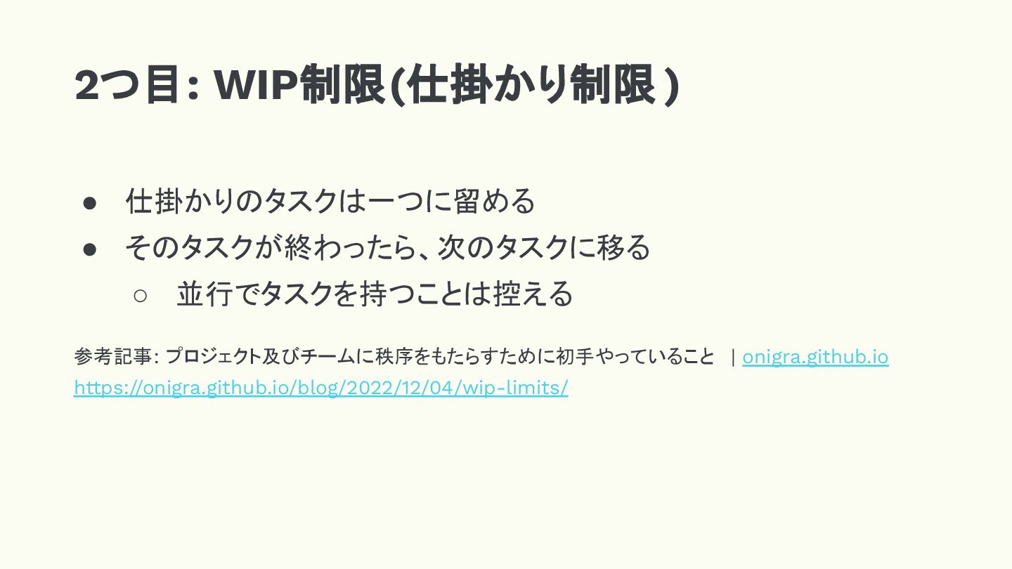 https://onigra.github.io/blog/2022/12/04/wip-limits/ 2つ目: WIP制限(仕掛かり制限 )