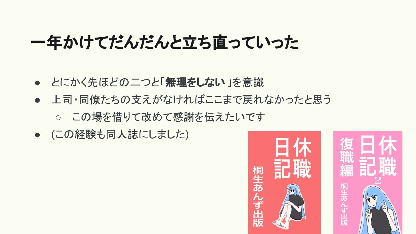 • とにかく先ほどの二つと「無理をしない 」を意識 • 上司・同僚たちの支えがなければここまで戻れなかったと思う ◦ この場を借りて改めて感謝を伝えたいです • (この経験も同人誌にしました) 一年かけてだんだんと立ち直っていった