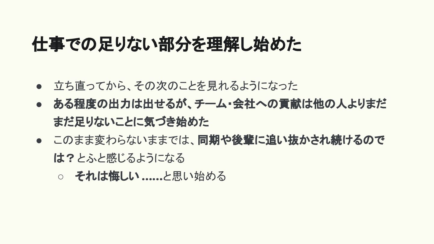 • 立ち直ってから、その次のことを見れるようになった • ある程度の出力は出せるが、チーム・会社への貢献は他の人よりまだ まだ足りないことに気づき始めた • このまま変わらないままでは、同期や後輩に追い抜かされ続けるので は?とふと感じるようになる ◦ それは悔しい