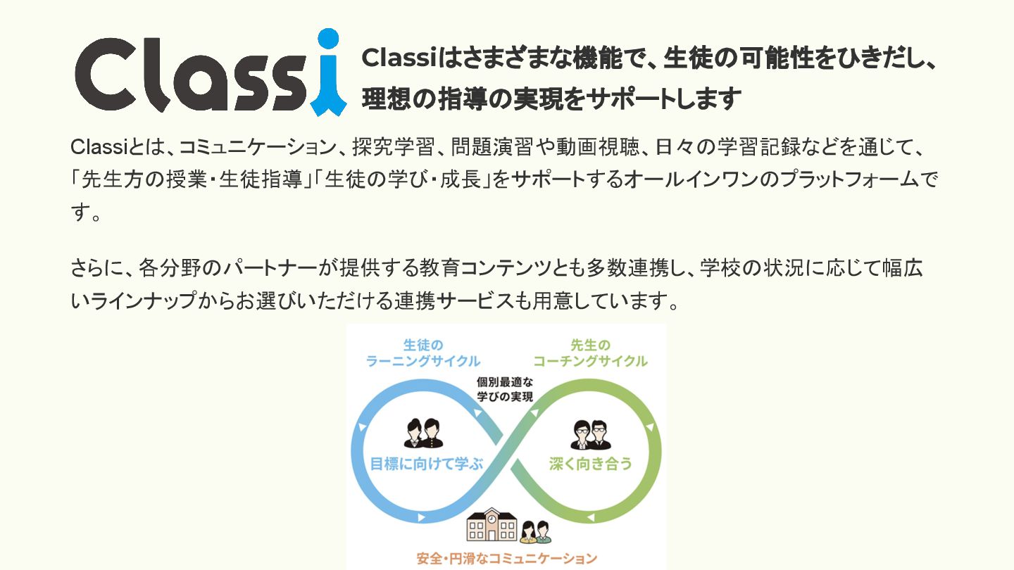 Classiとは、コミュニケーション、探究学習、問題演習や動画視聴、日々の学習記録などを通じて、 「先生方の授業・生徒指導」「生徒の学び・成長」をサポートするオールインワンのプラットフォームで す。 さらに、各分野のパートナーが提供する教育コンテンツとも多数連携し、学校の状況に応じて幅広 いラインナップからお選びいただける連携サービスも用意しています。 Classiはさまざまな機能で、生徒の可能性をひきだし、 理想の指導の実現をサポートします