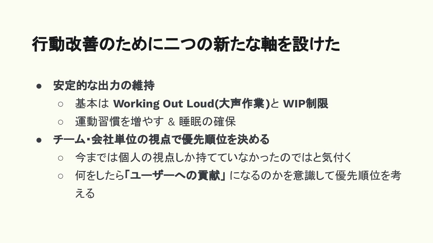 & 睡眠の確保 • チーム・会社単位の視点で優先順位を決める ◦ 今までは個人の視点しか持てていなかったのではと気付く ◦ 何をしたら「ユーザーへの貢献」 になるのかを意識して優先順位を考 える 行動改善のために二つの新たな軸を設けた