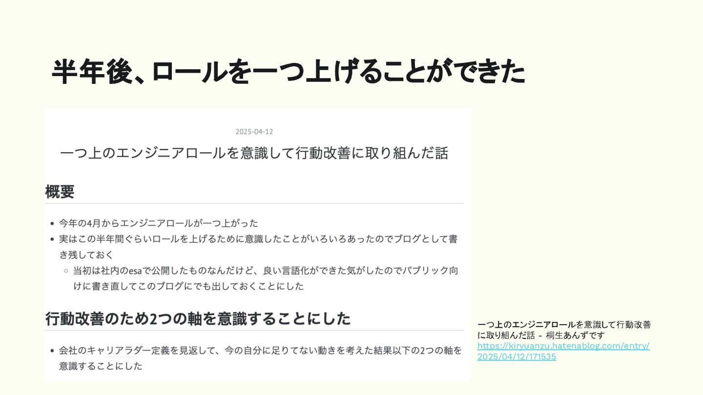 三浦半島.rb を立ち上げて良かったこと - 桐生あんずです https://kiryuanzu.hatenablog.com/entry/2025/09/26/002349 半年後、ロールを一つ上げることができた 一つ上のエンジニアロールを意識して行動改善 に取り組んだ話 - 桐生あんずです