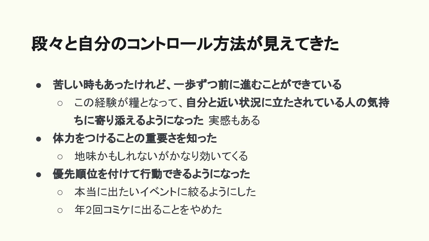 • 優先順位を付けて行動できるようになった ◦ 本当に出たいイベントに絞るようにした ◦ 年2回コミケに出ることをやめた 段々と自分のコントロール方法が見えてきた