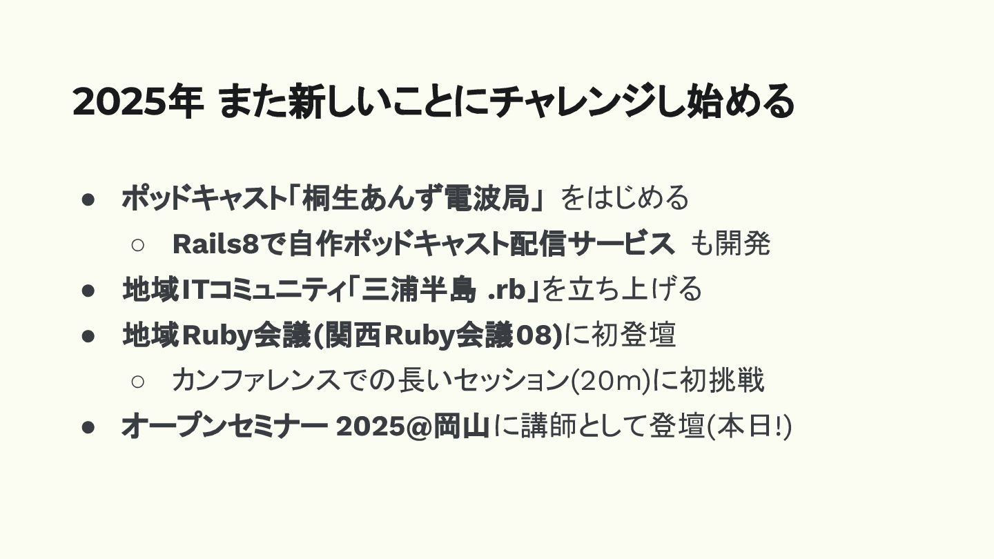 地域Ruby会議(関西Ruby会議08)に初登壇 ◦ カンファレンスでの長いセッション(20m)に初挑戦 • オープンセミナー 2025@岡山に講師として登壇(本日!) 2025年 また新しいことにチャレンジし始める