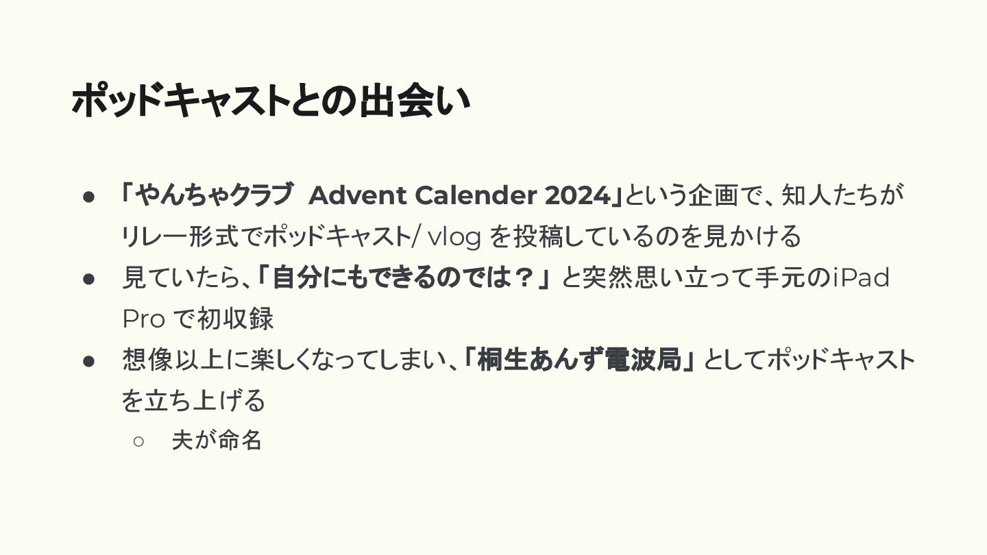 • 「やんちゃクラブ Advent Calender 2024」という企画で、知人たちが リレー形式でポッドキャスト/ vlog を投稿しているのを見かける • 見ていたら、「自分にもできるのでは?」
