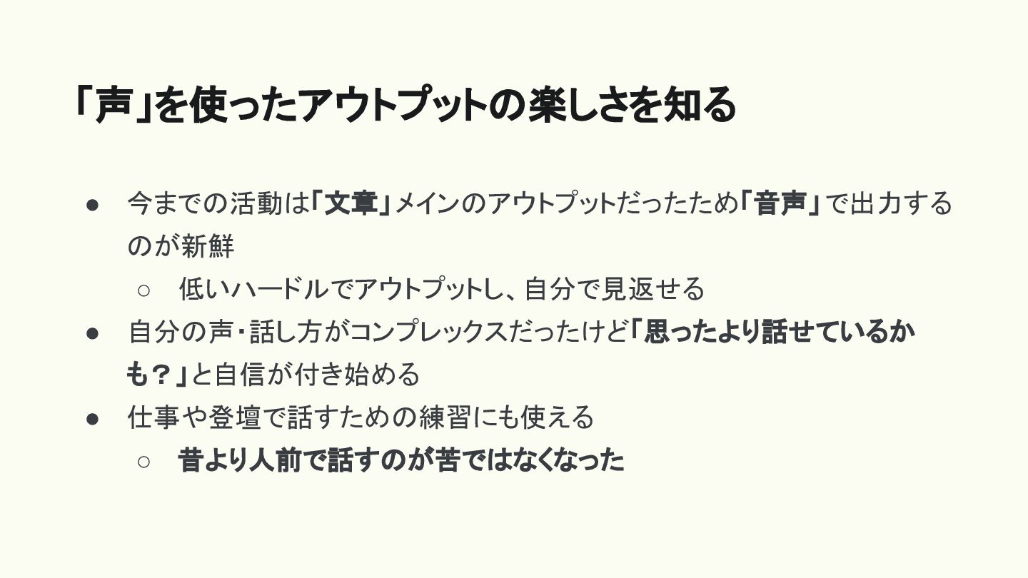 • 今までの活動は「文章」メインのアウトプットだったため「音声」で出力する のが新鮮 ◦ 低いハードルでアウトプットし、自分で見返せる • 自分の声・話し方がコンプレックスだったけど「思ったより話せているか も?」と自信が付き始める • 仕事や登壇で話すための練習にも使える