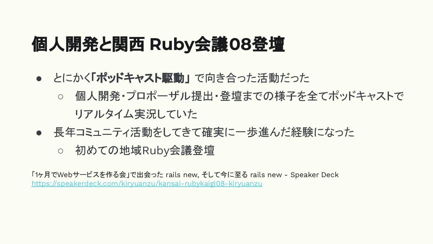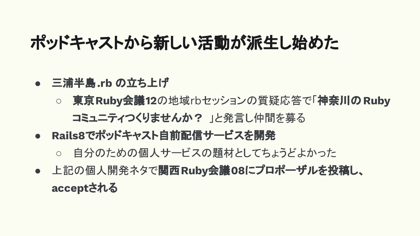 自分のための個人サービスの題材としてちょうどよかった • 上記の個人開発ネタで関西Ruby会議08にプロポーザルを投稿し、 acceptされる ポッドキャストから新しい活動が派生し始めた