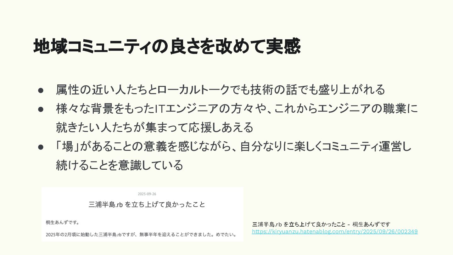 • 属性の近い人たちとローカルトークでも技術の話でも盛り上がれる • 様々な背景をもったITエンジニアの方々や、これからエンジニアの職業に 就きたい人たちが集まって応援しあえる • 「場」があることの意義を感じながら、自分なりに楽しくコミュニティ運営し 続けることを意識している 地域コミュニティの良さを改めて実感 三浦半島.rb