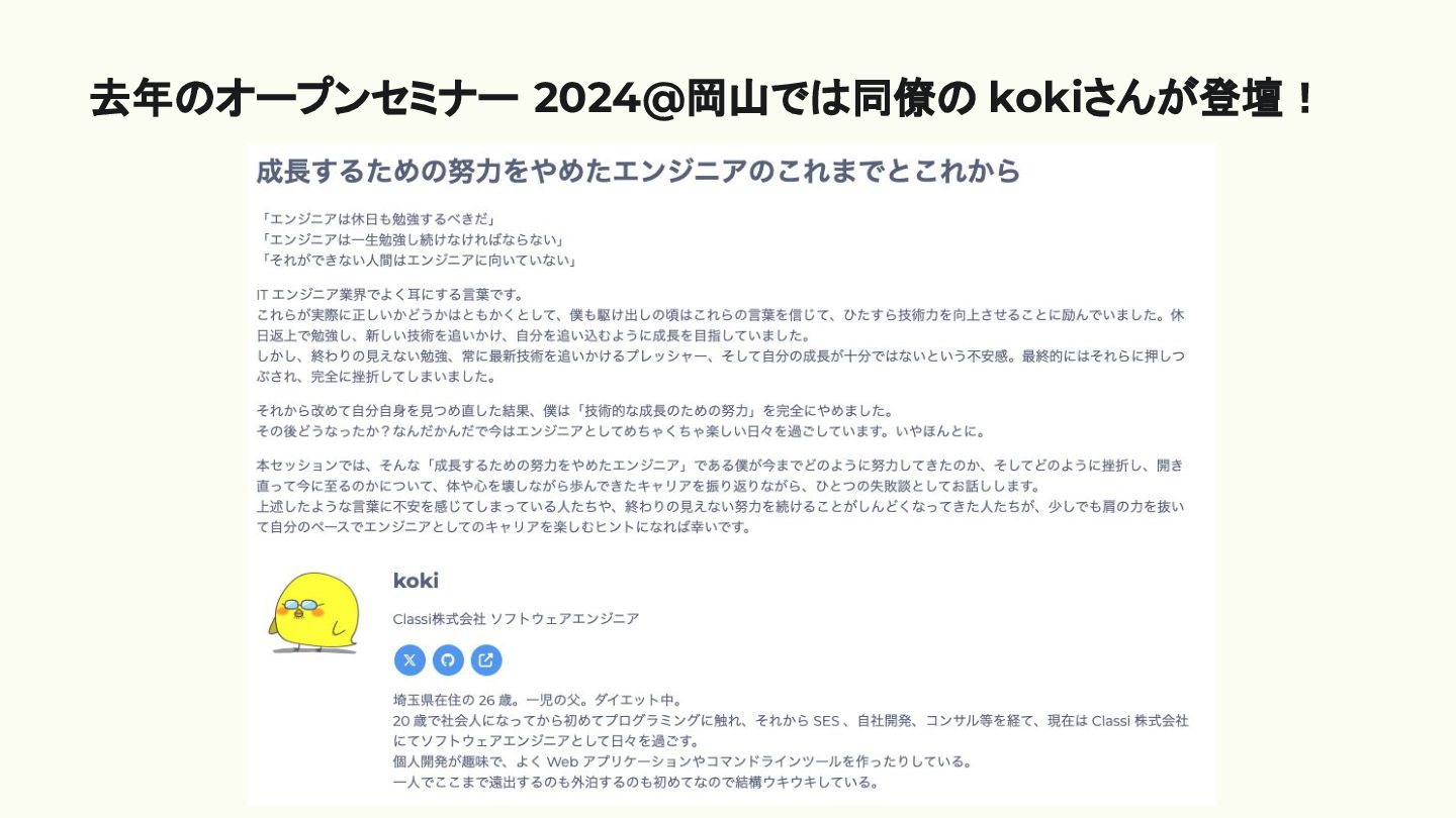 去年のオープンセミナー 2024@岡山では同僚の kokiさんが登壇!
