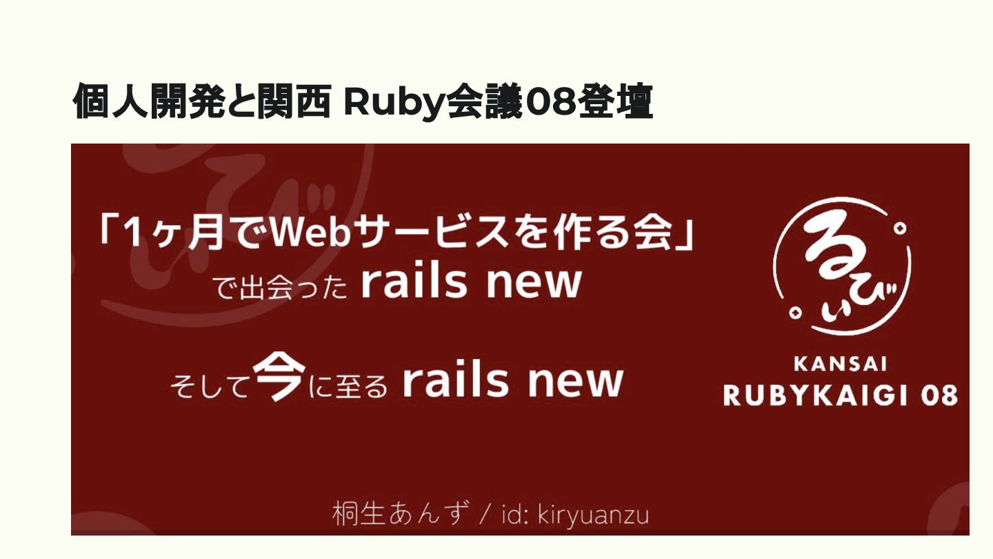 個人開発と関西 Ruby会議08登壇 「1ヶ月でWebサービスを作る会」で出会った rails new, そして今に至る rails new - Speaker Deck https://speakerdeck.com/kiryuanzu/kansai-rubykaigi08-kiryuanzu