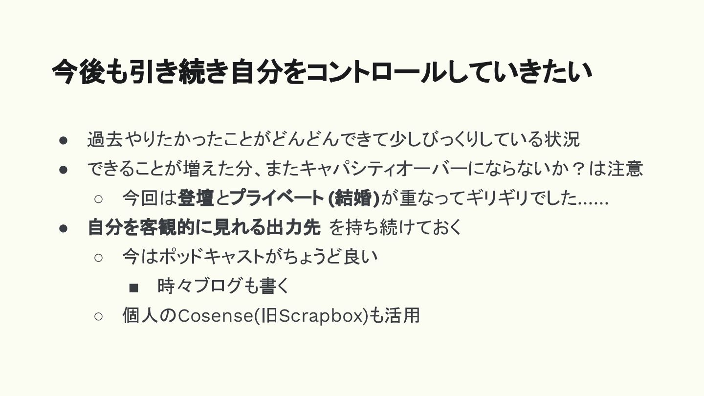 • 過去やりたかったことがどんどんできて少しびっくりしている状況 • できることが増えた分、またキャパシティオーバーにならないか?は注意 ◦ 今回は登壇とプライベート (結婚)が重なってギリギリでした…… • 自分を客観的に見れる出力先 を持ち続けておく