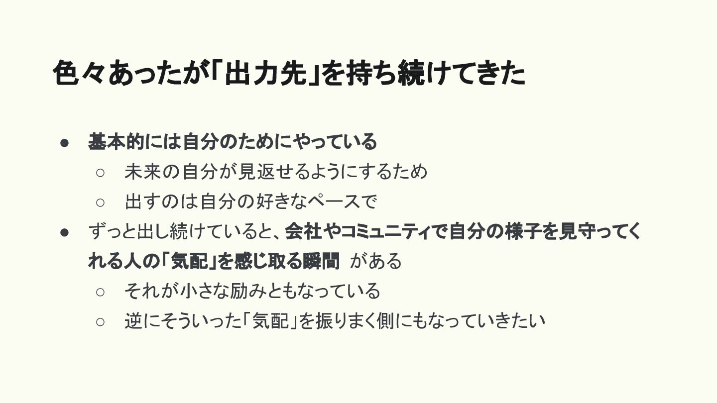 • 基本的には自分のためにやっている ◦ 未来の自分が見返せるようにするため ◦ 出すのは自分の好きなペースで • ずっと出し続けていると、会社やコミュニティで自分の様子を見守ってく れる人の「気配」を感じ取る瞬間 がある