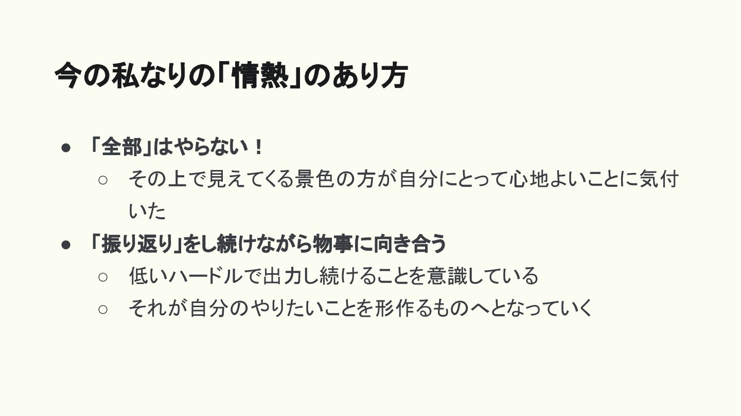 • 「全部」はやらない! ◦ その上で見えてくる景色の方が自分にとって心地よいことに気付 いた • 「振り返り」をし続けながら物事に向き合う ◦ 低いハードルで出力し続けることを意識している ◦