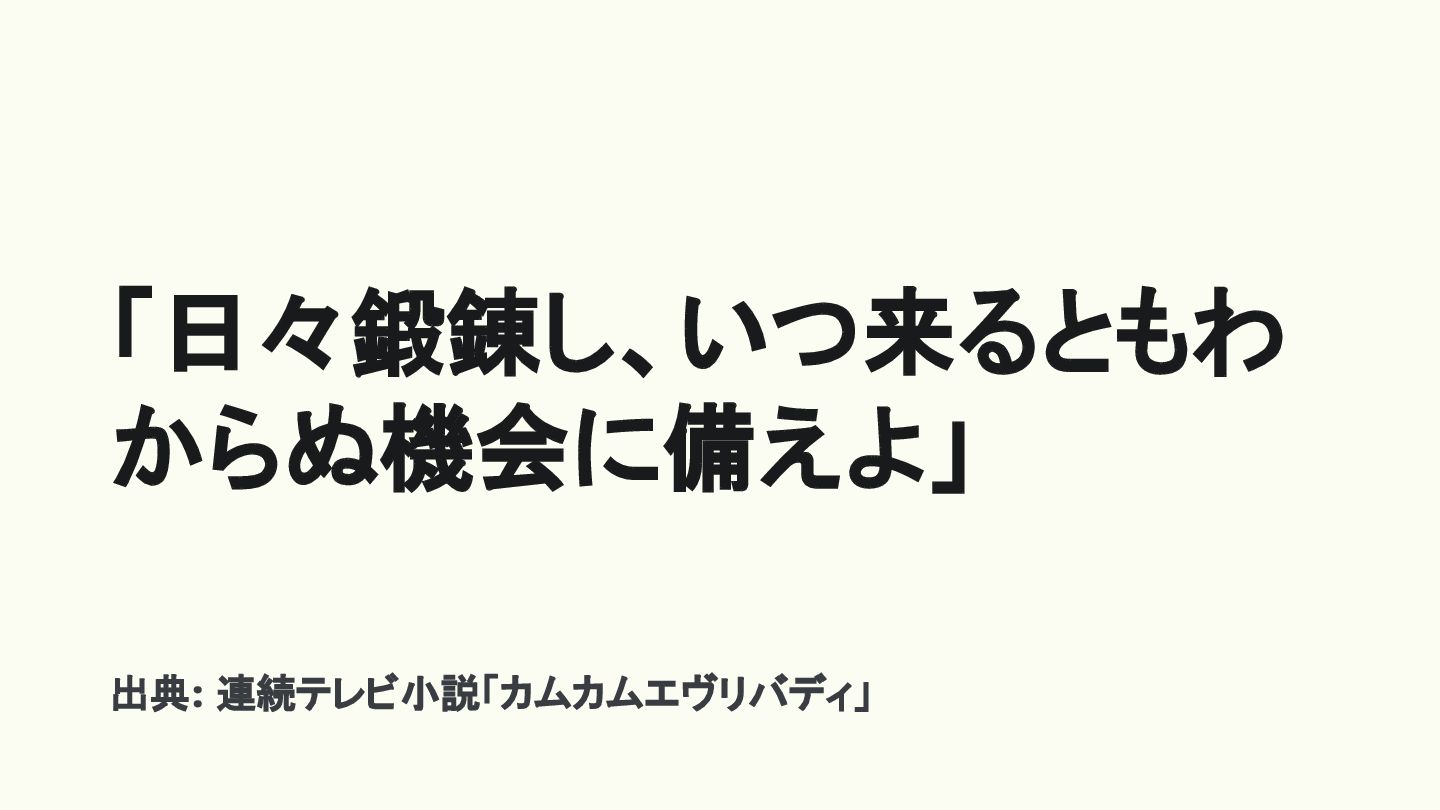 「日々鍛錬し、いつ来るともわ からぬ機会に備えよ」 出典: 連続テレビ小説「カムカムエヴリバディ」