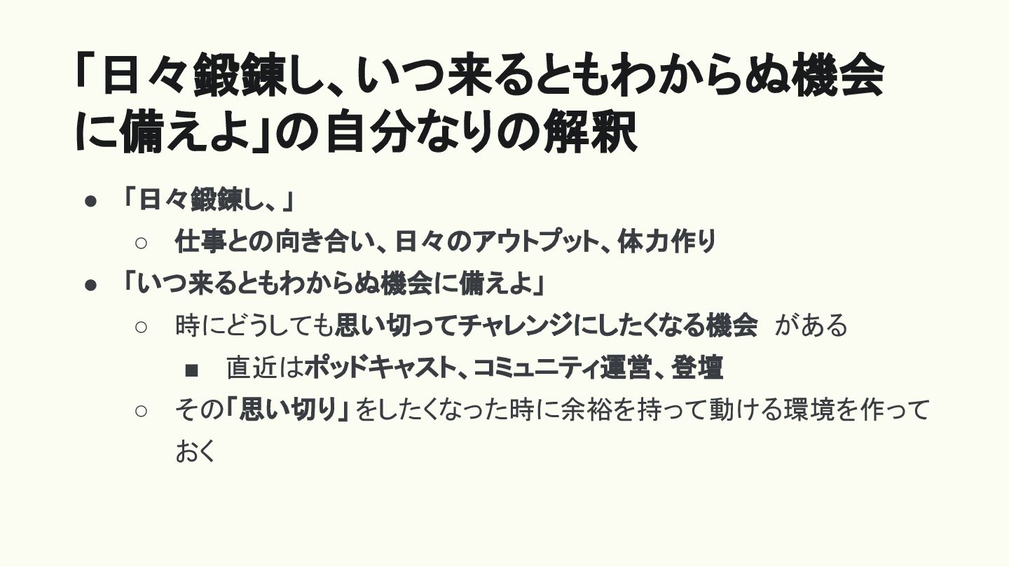 直近はポッドキャスト、コミュニティ運営、登壇 ◦ その「思い切り」 をしたくなった時に余裕を持って動ける環境を作って おく 「日々鍛錬し、いつ来るともわからぬ機会 に備えよ」の自分なりの解釈