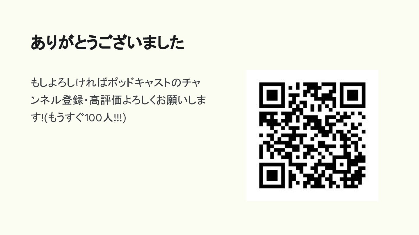 もしよろしければポッドキャストのチャ ンネル登録・高評価よろしくお願いしま す!(もうすぐ100人!!!) ありがとうございました