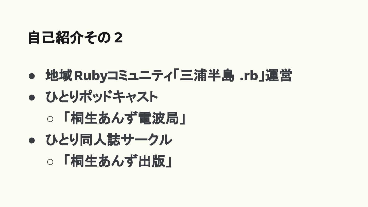 • 地域Rubyコミュニティ「三浦半島 .rb」運営 • ひとりポッドキャスト ◦ 「桐生あんず電波局」 • ひとり同人誌サークル ◦
