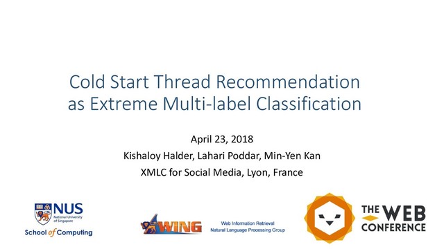 Slides presented at the Extreme Multilabel Classification for Social Media Workshop held in conjunction with The Web Conference 2018 in Lyon, France. #resSys #deepLearning #nlp #WING-NUS