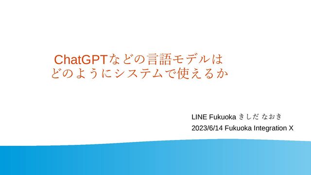 ChatGPTなどの言語モデルは どのようにシステムで使えるか LINE Fukuoka きしだ なおき 2023/6/14 Fukuoka Integration X