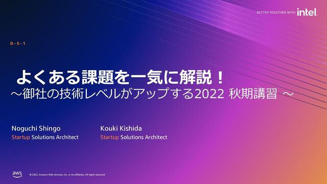 rights reserved. © 2022, Amazon Web Services, Inc. or its affiliates. All rights reserved. よくある課題を⼀気に解説︕ 〜御社の技術レベルがアップする2022 秋期講習 〜 Kouki Kishida D - 5 - 1 Startup Solutions Architect Noguchi Shingo Startup Solutions Architect