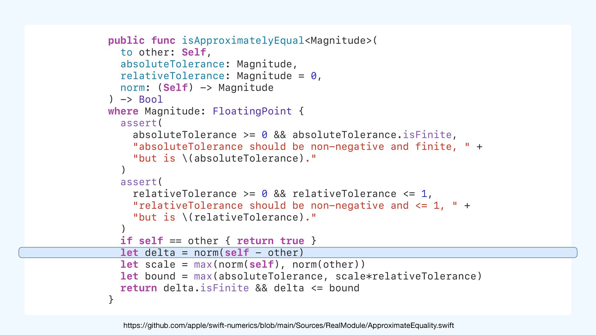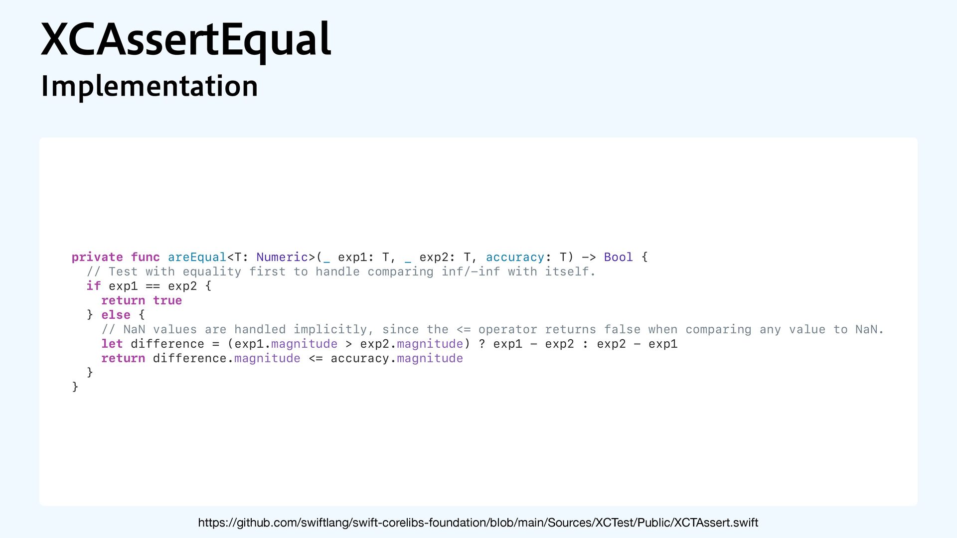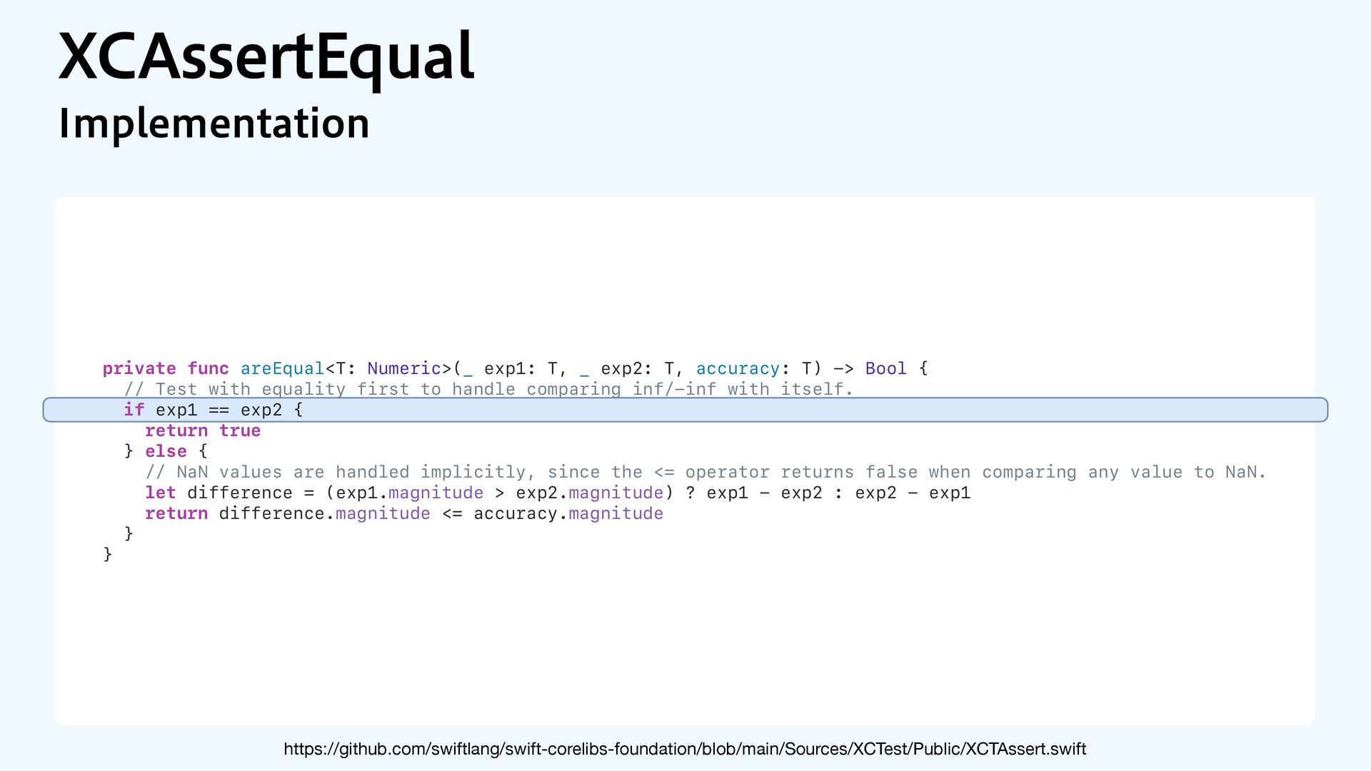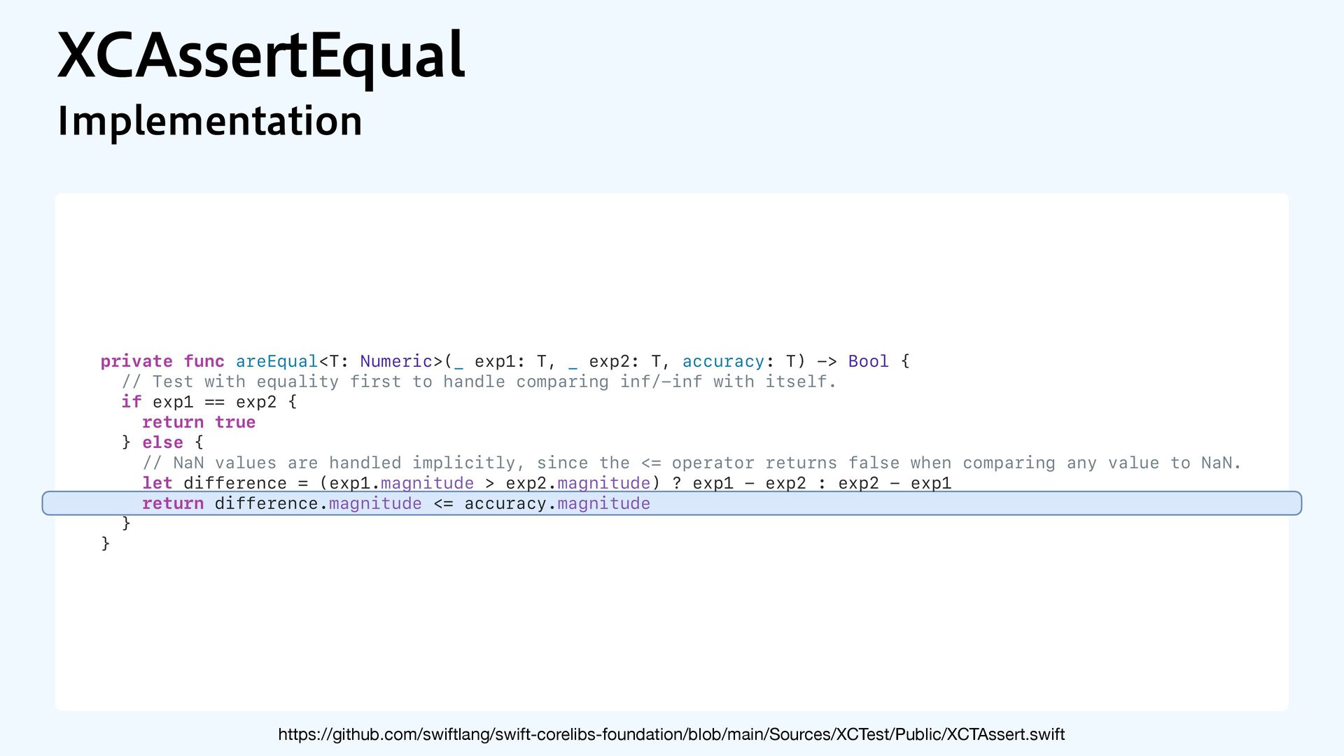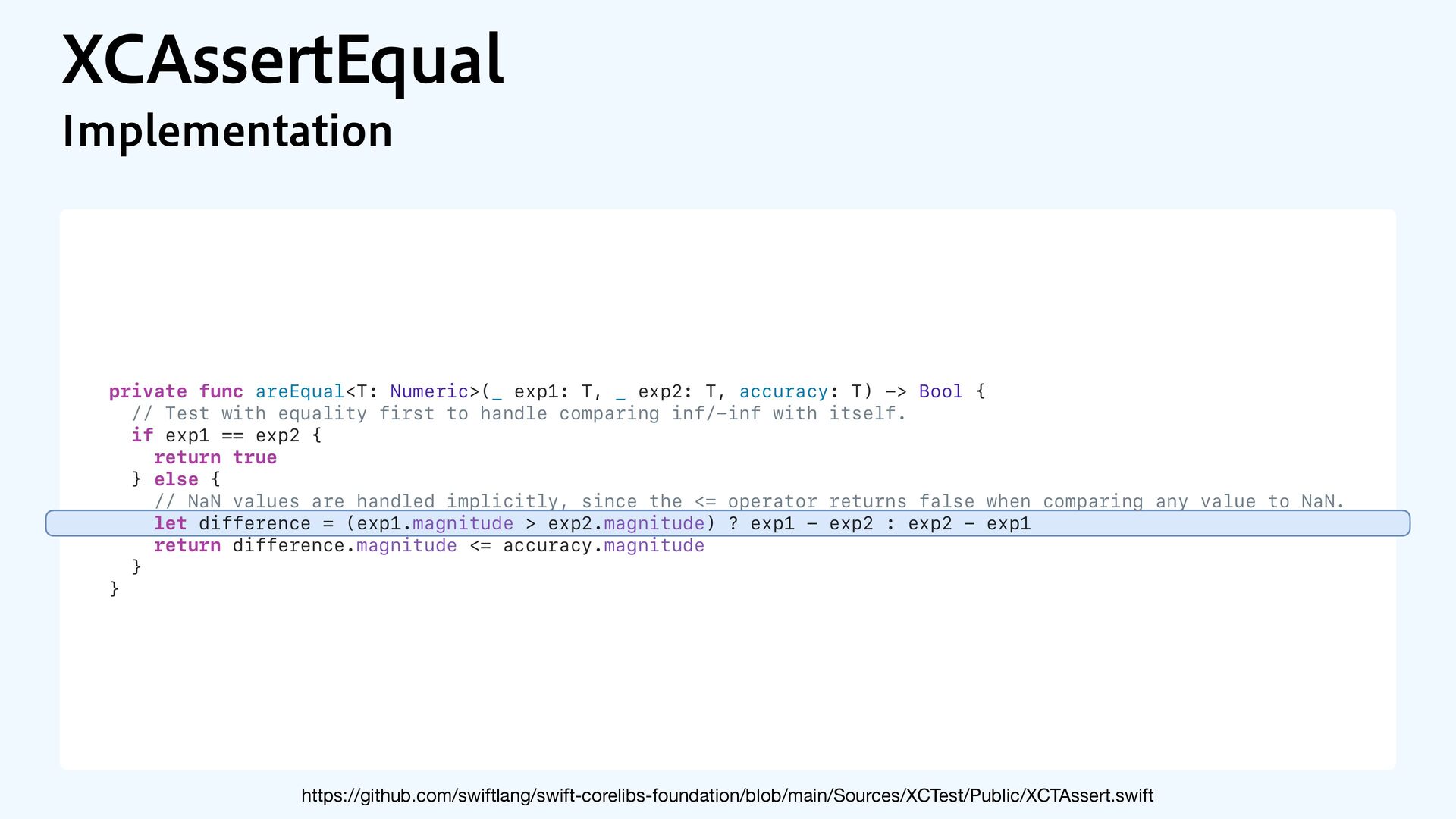 T, accuracy: T) -> Bool { // Test with equality first to handle comparing inf/-inf with itself. if exp1 == exp2 { return true } else { // NaN values are handled implicitly, since the <= operator returns false when comparing any value to NaN. let difference = (exp1.magnitude > exp2.magnitude) ? exp1 - exp2 : exp2 - exp1 return difference.magnitude <= accuracy.magnitude } } https://github.com/swiftlang/swift-corelibs-foundation/blob/main/Sources/XCTest/Public/XCTAssert.swift