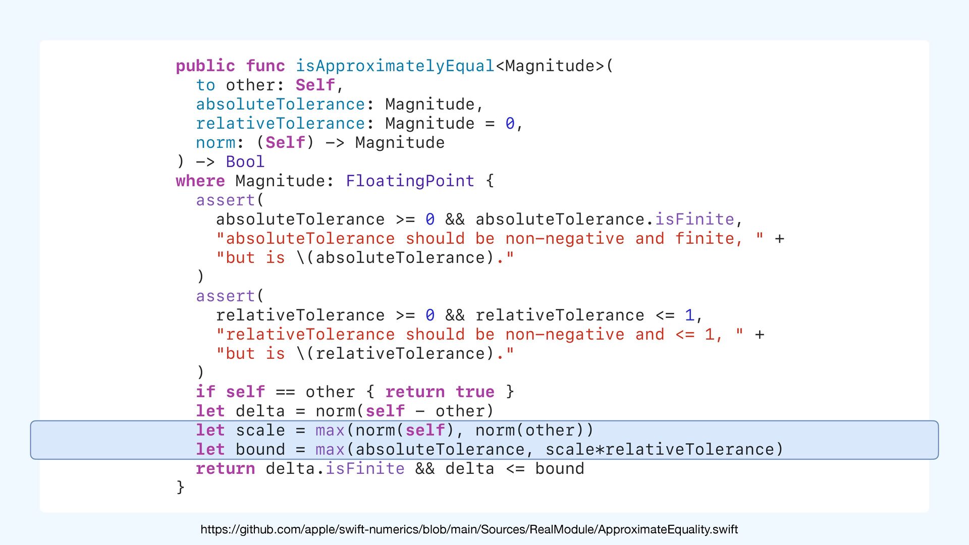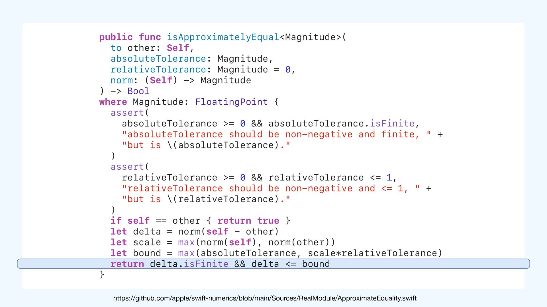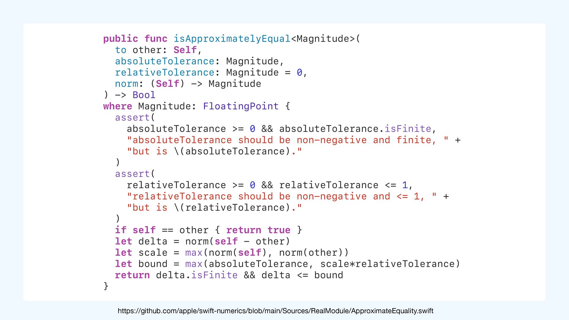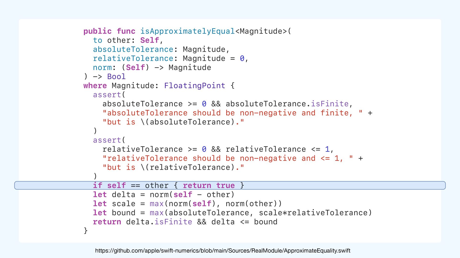 T, accuracy: T) -> Bool { // Test with equality first to handle comparing inf/-inf with itself. if exp1 == exp2 { return true } else { // NaN values are handled implicitly, since the <= operator returns false when comparing any value to NaN. let difference = (exp1.magnitude > exp2.magnitude) ? exp1 - exp2 : exp2 - exp1 return difference.magnitude <= accuracy.magnitude } } https://github.com/swiftlang/swift-corelibs-foundation/blob/main/Sources/XCTest/Public/XCTAssert.swift