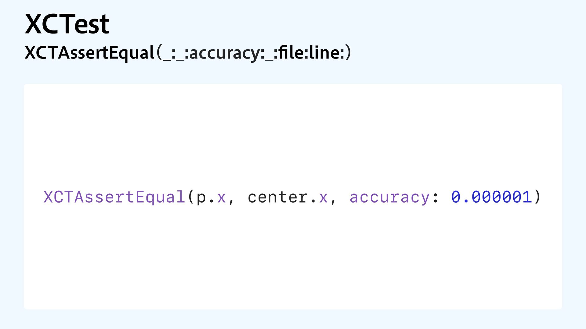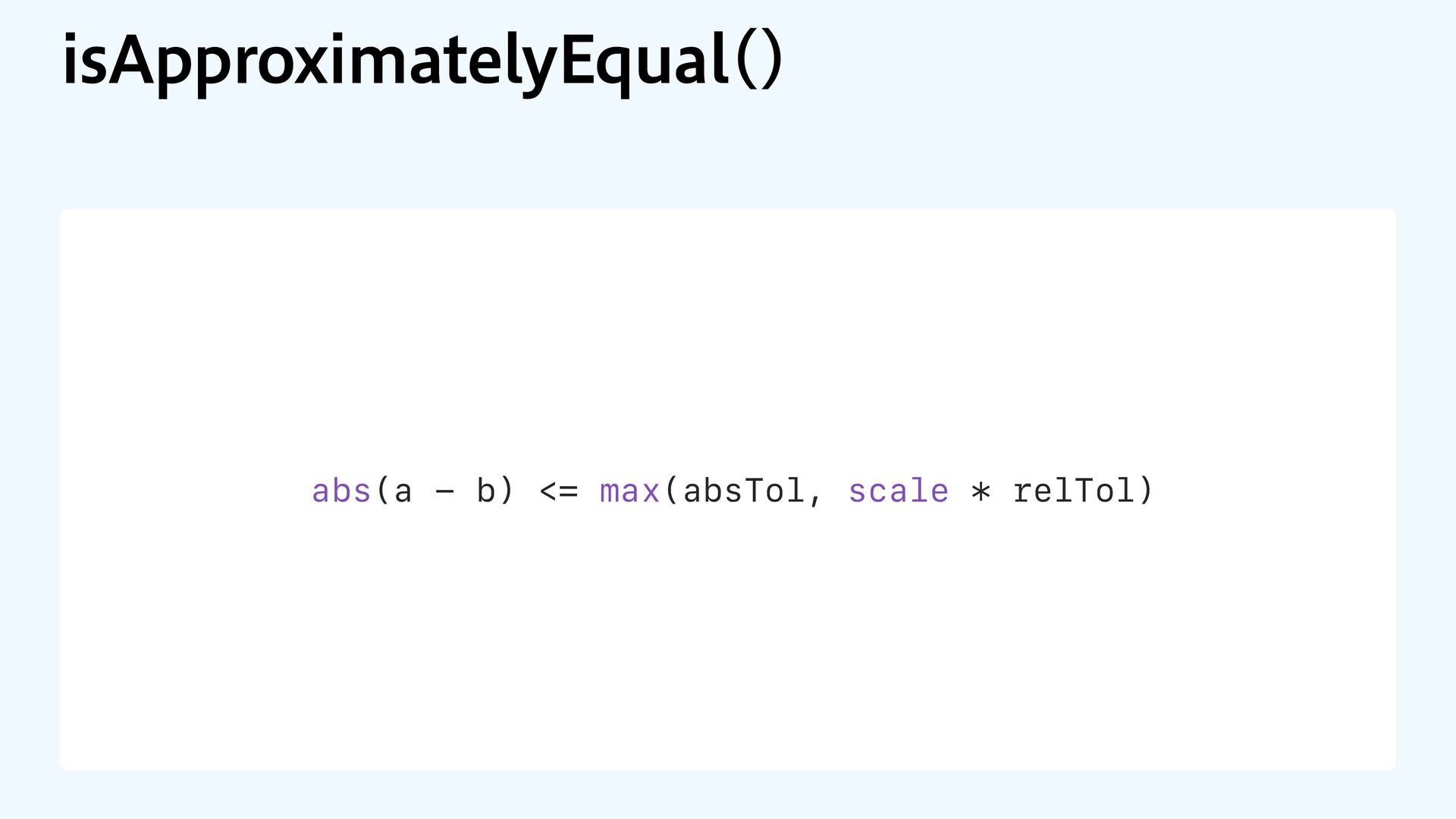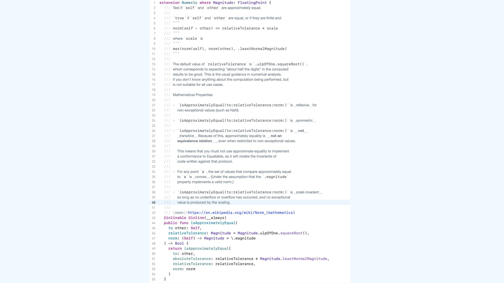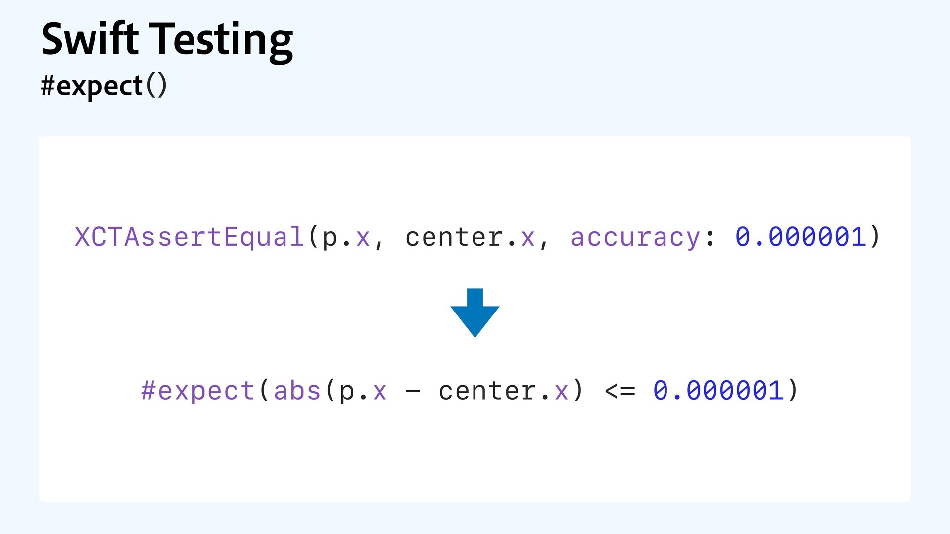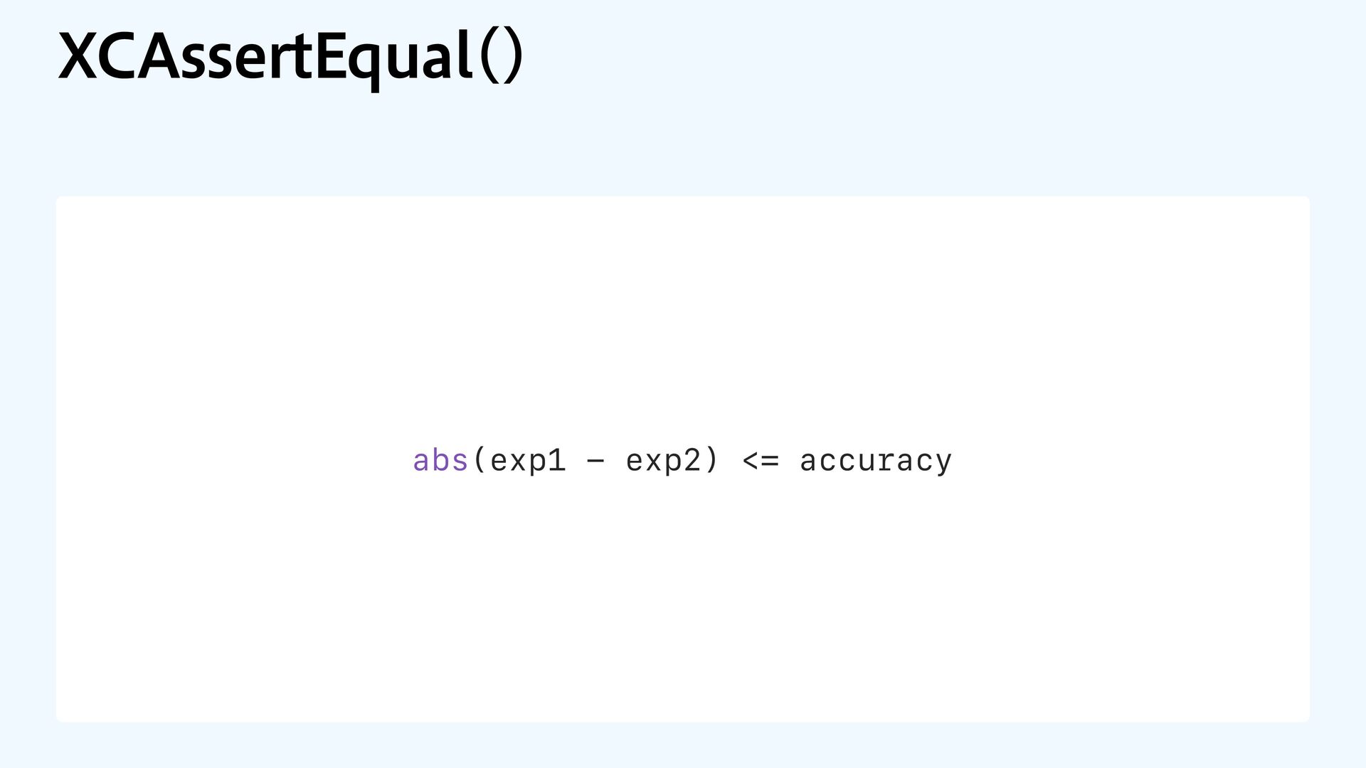 T, accuracy: T) -> Bool { // Test with equality first to handle comparing inf/-inf with itself. if exp1 == exp2 { return true } else { // NaN values are handled implicitly, since the <= operator returns false when comparing any value to NaN. let difference = (exp1.magnitude > exp2.magnitude) ? exp1 - exp2 : exp2 - exp1 return difference.magnitude <= accuracy.magnitude } } https://github.com/swiftlang/swift-corelibs-foundation/blob/main/Sources/XCTest/Public/XCTAssert.swift