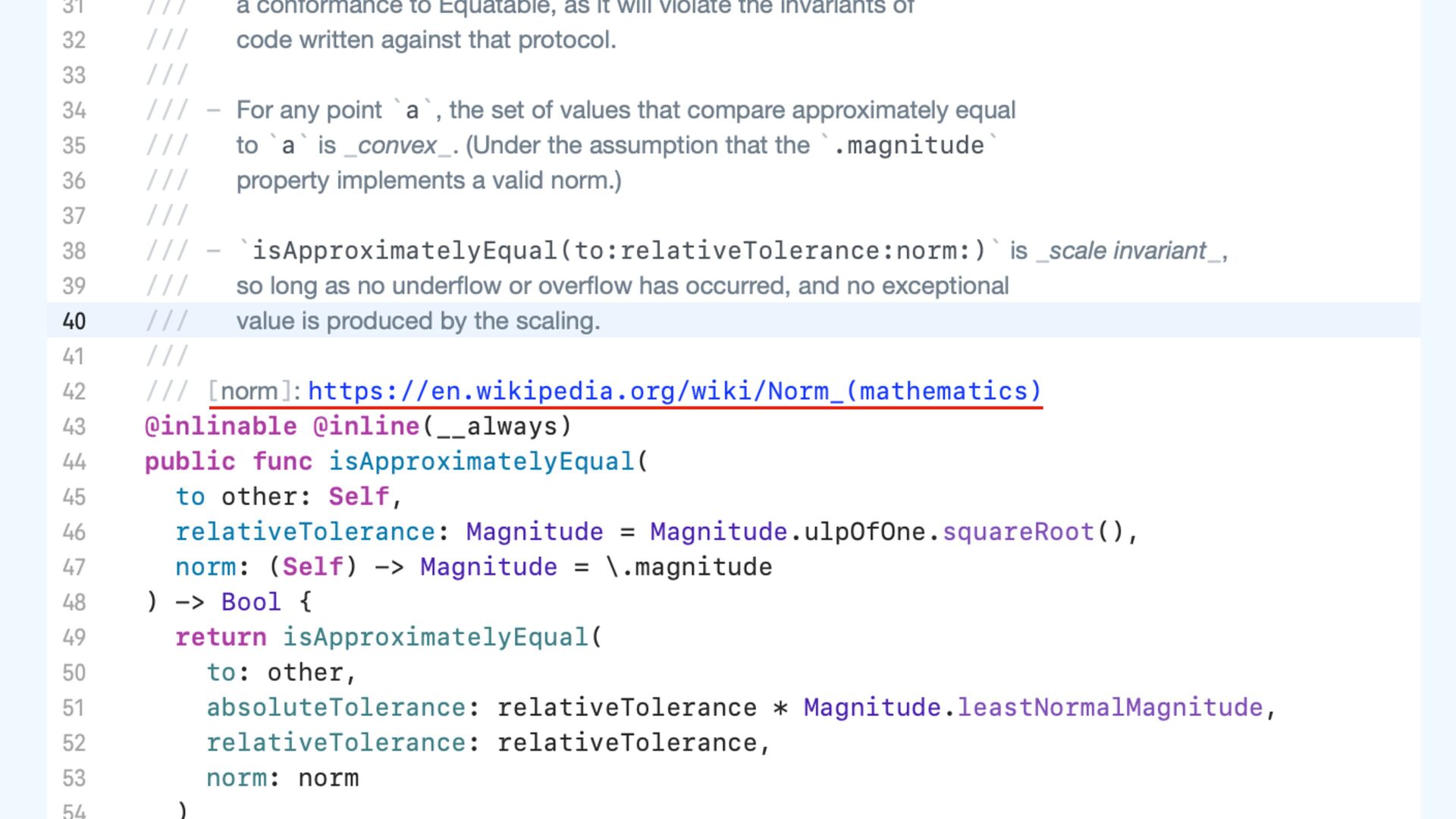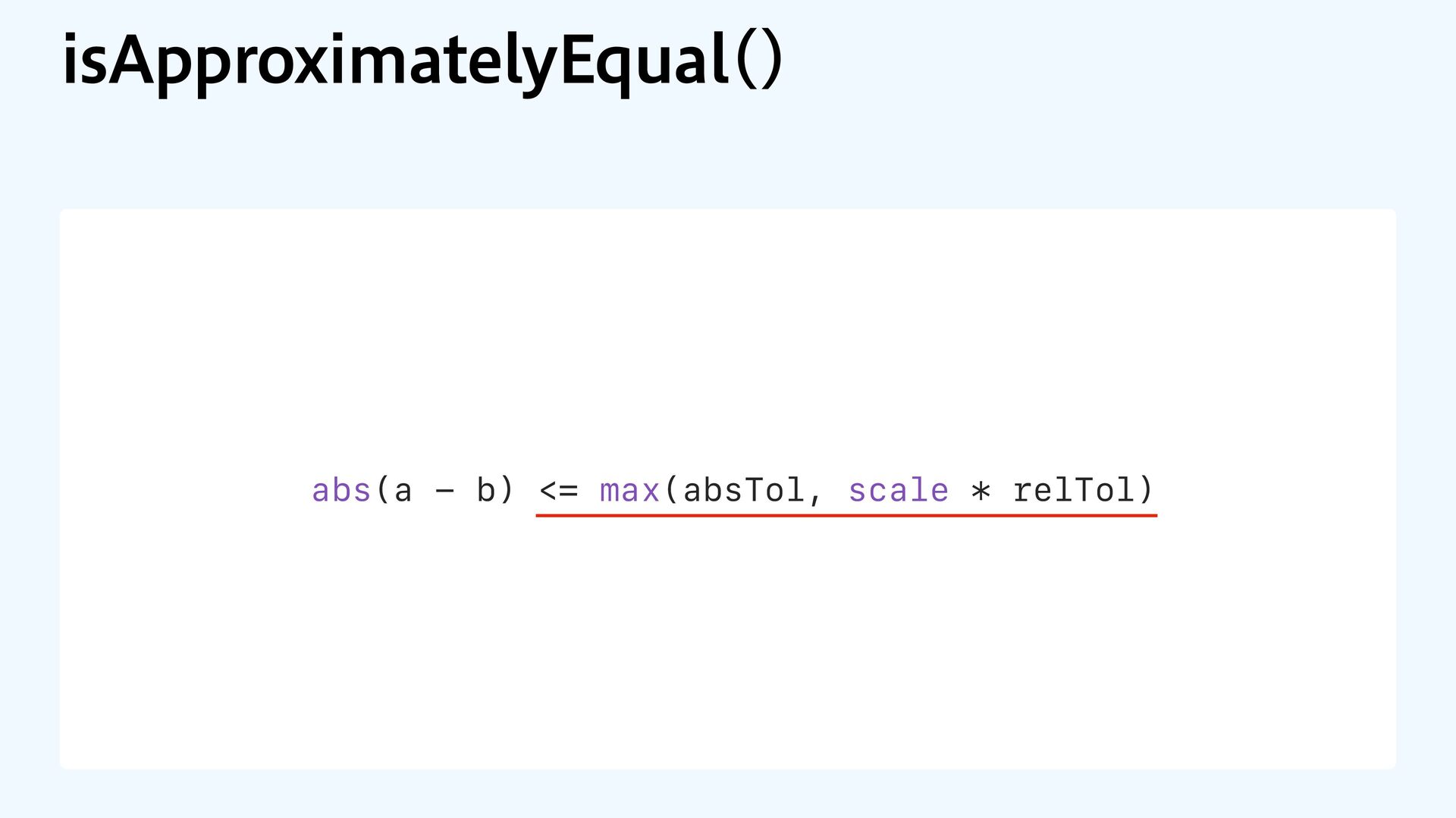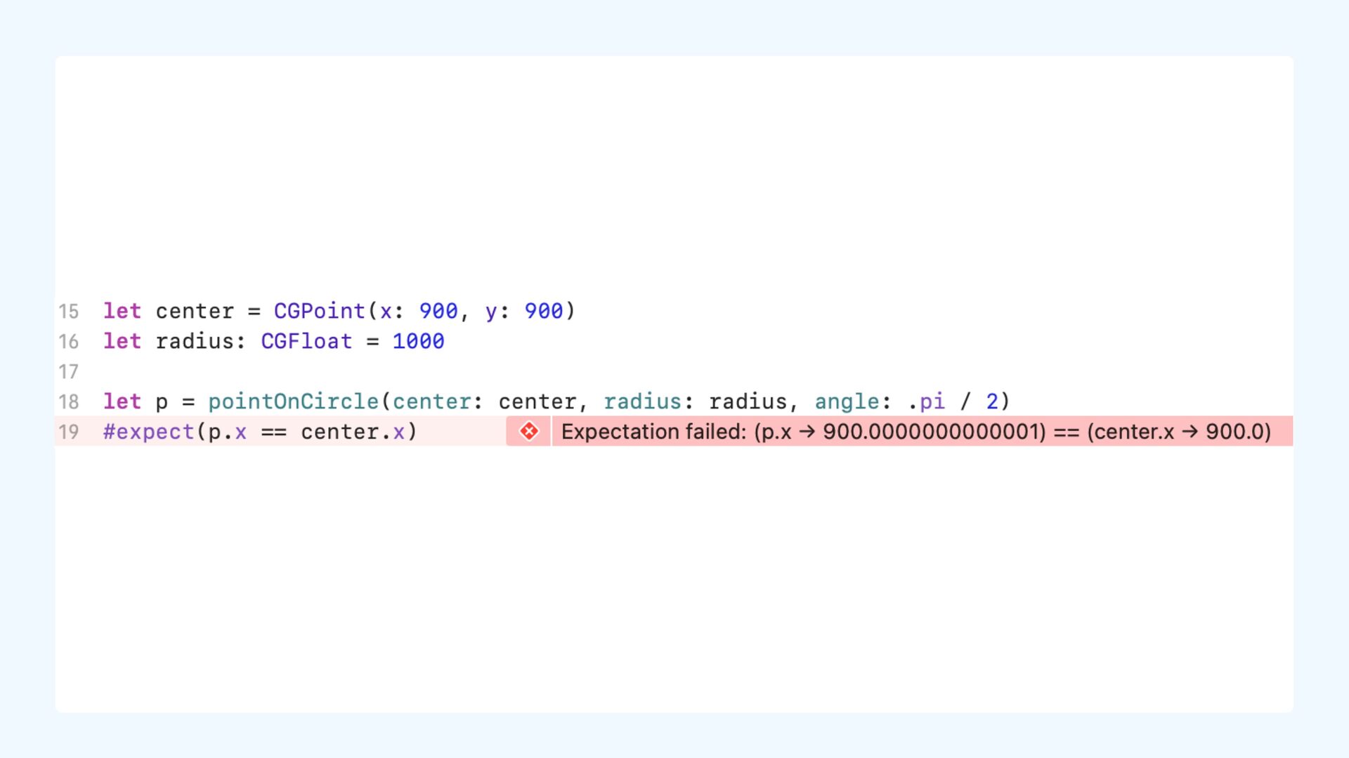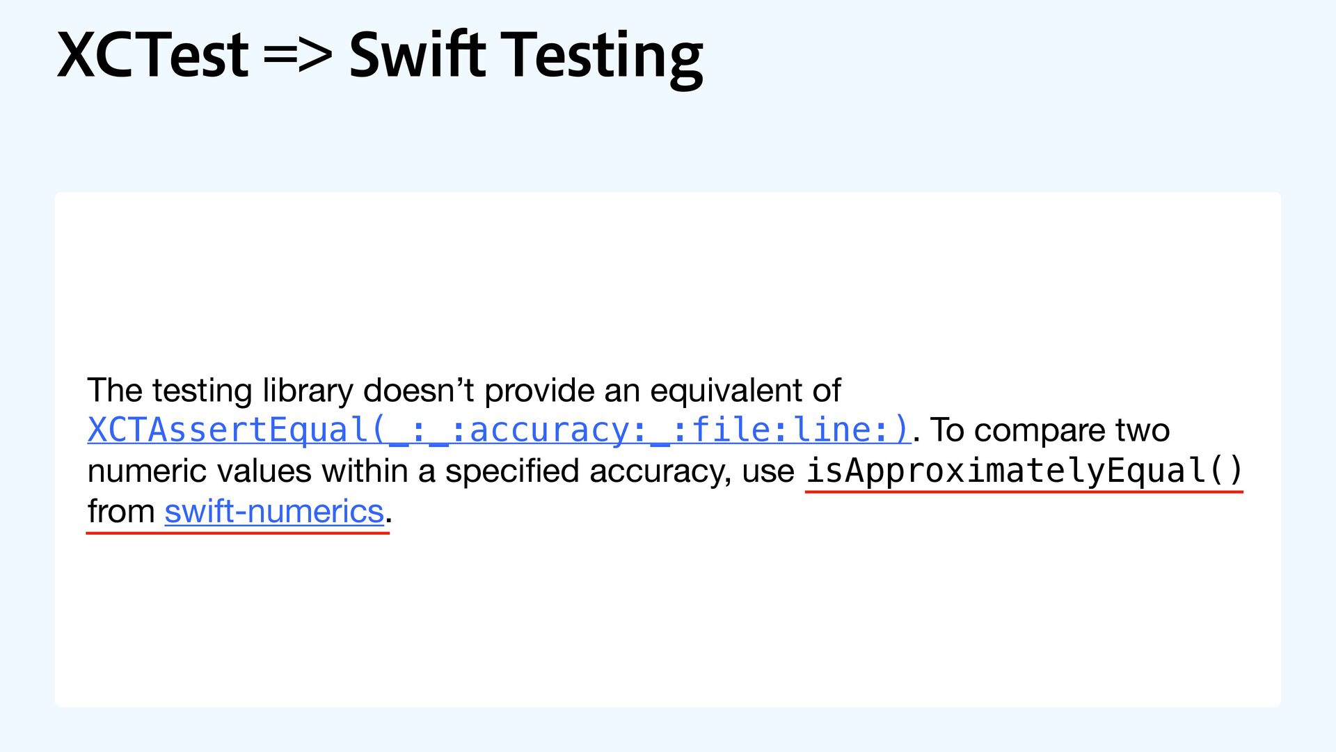 T, accuracy: T) -> Bool { // Test with equality first to handle comparing inf/-inf with itself. if exp1 == exp2 { return true } else { // NaN values are handled implicitly, since the <= operator returns false when comparing any value to NaN. let difference = (exp1.magnitude > exp2.magnitude) ? exp1 - exp2 : exp2 - exp1 return difference.magnitude <= accuracy.magnitude } } https://github.com/swiftlang/swift-corelibs-foundation/blob/main/Sources/XCTest/Public/XCTAssert.swift
