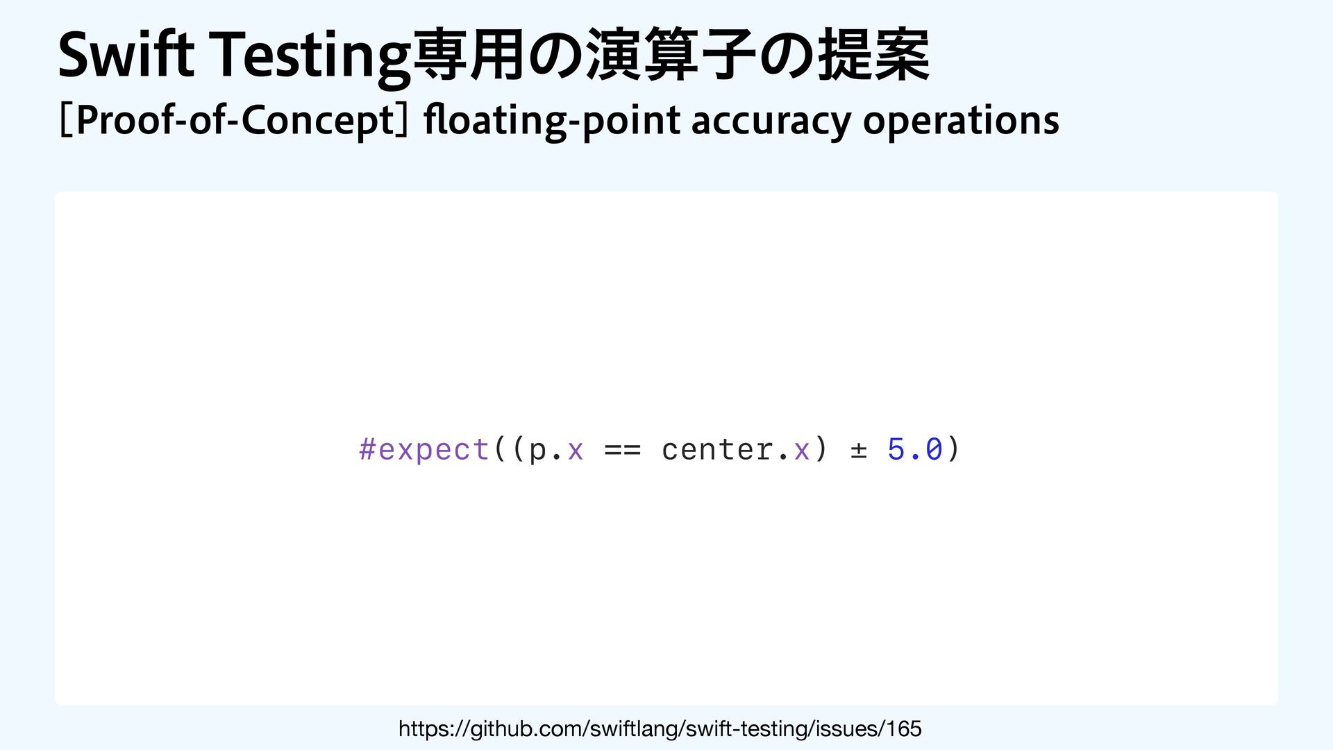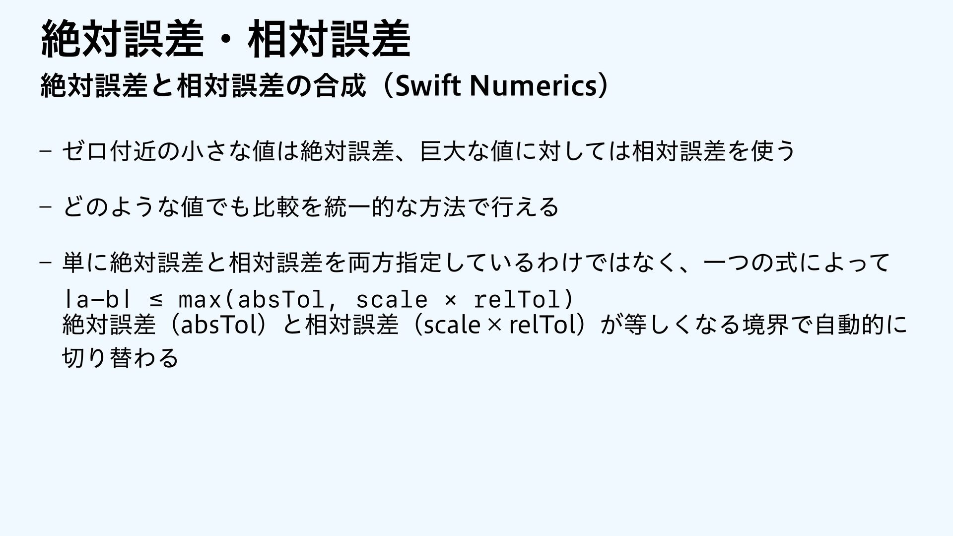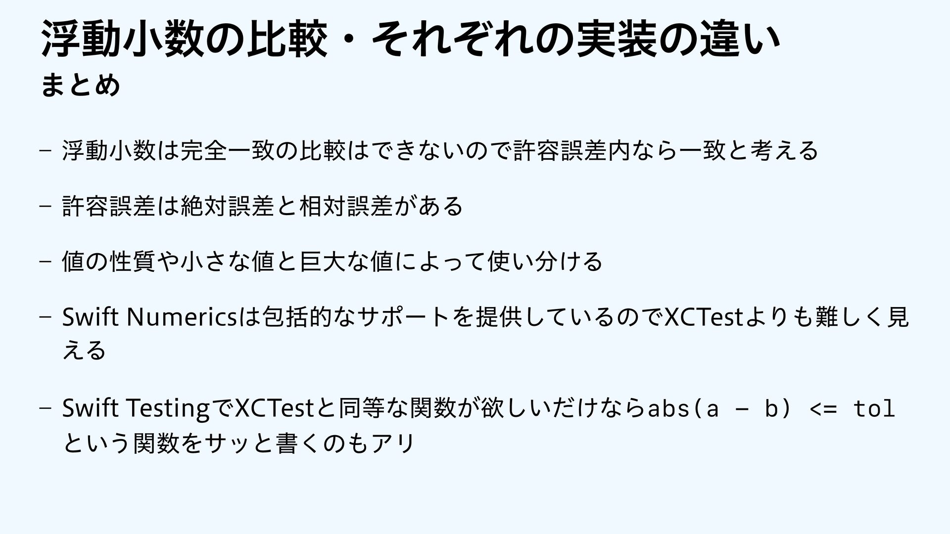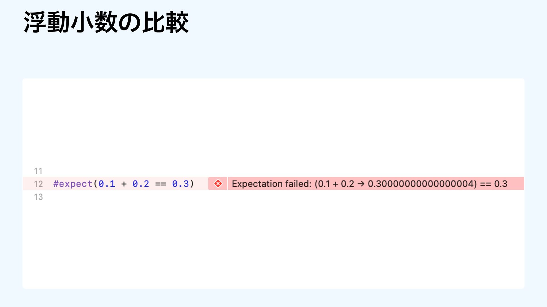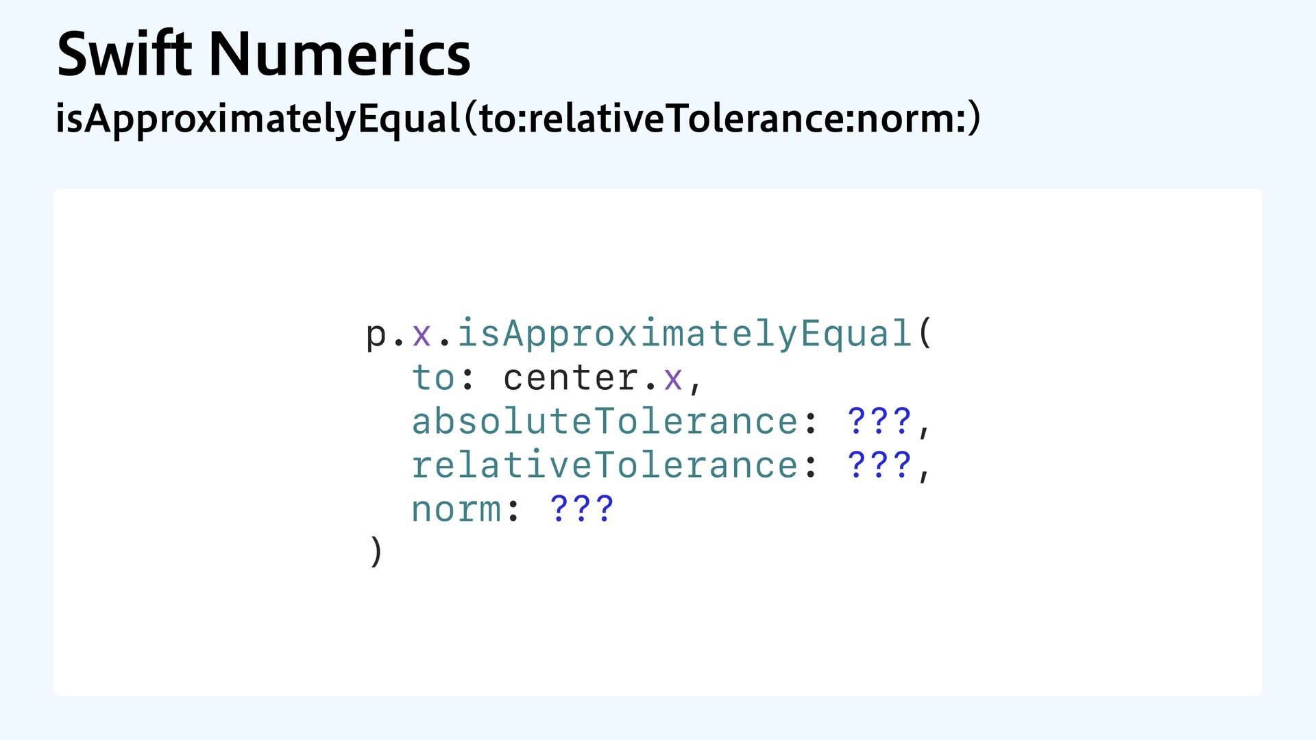 T, accuracy: T) -> Bool { // Test with equality first to handle comparing inf/-inf with itself. if exp1 == exp2 { return true } else { // NaN values are handled implicitly, since the <= operator returns false when comparing any value to NaN. let difference = (exp1.magnitude > exp2.magnitude) ? exp1 - exp2 : exp2 - exp1 return difference.magnitude <= accuracy.magnitude } } https://github.com/swiftlang/swift-corelibs-foundation/blob/main/Sources/XCTest/Public/XCTAssert.swift