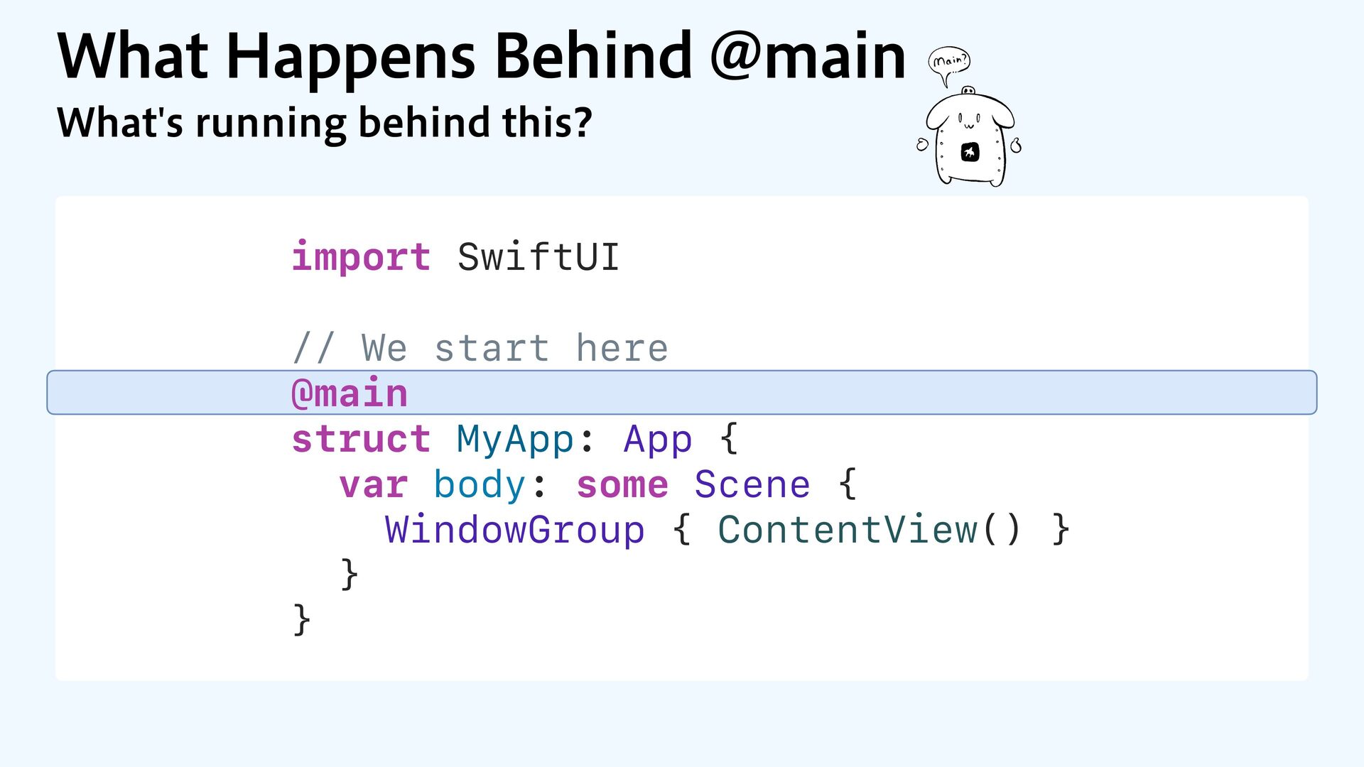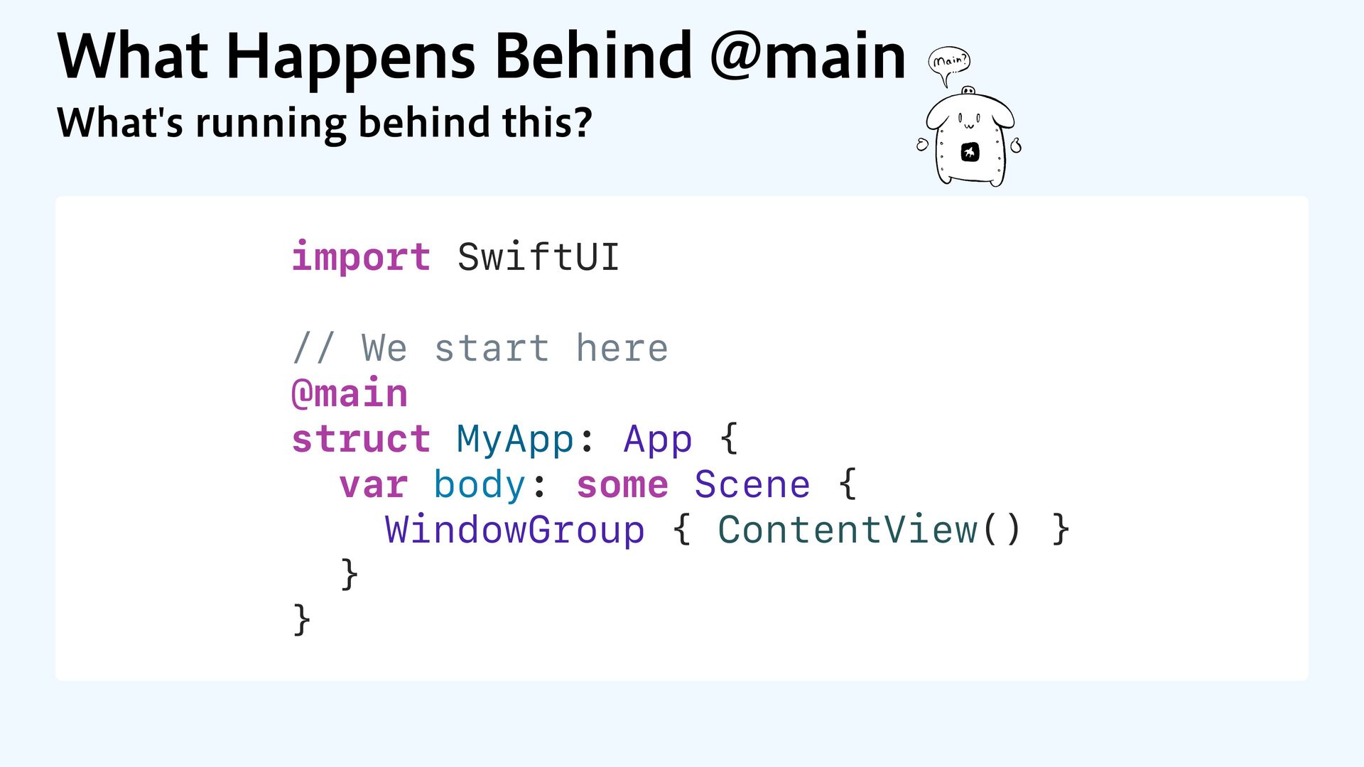 8IBUTSVOOJOHCFIJOEUIJT import SwiftUI // We start here @main struct MyApp: App { var body: some Scene { WindowGroup { ContentView() } } } 8IBU)BQQFOT#FIJOE!NBJO
