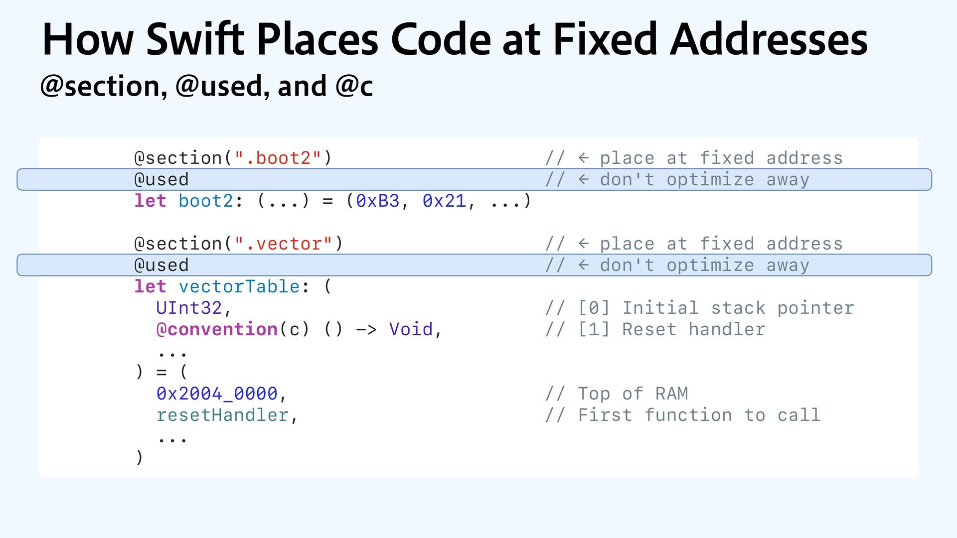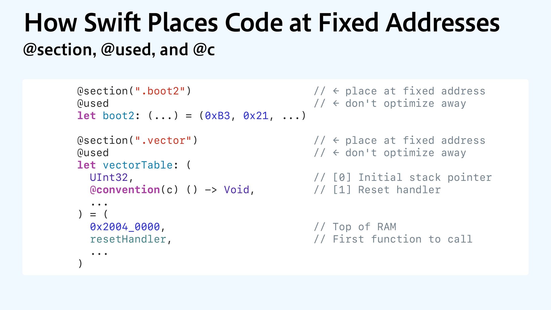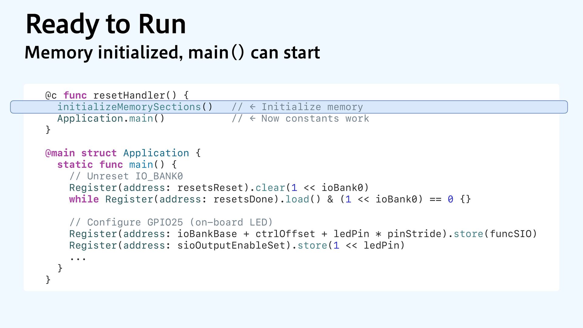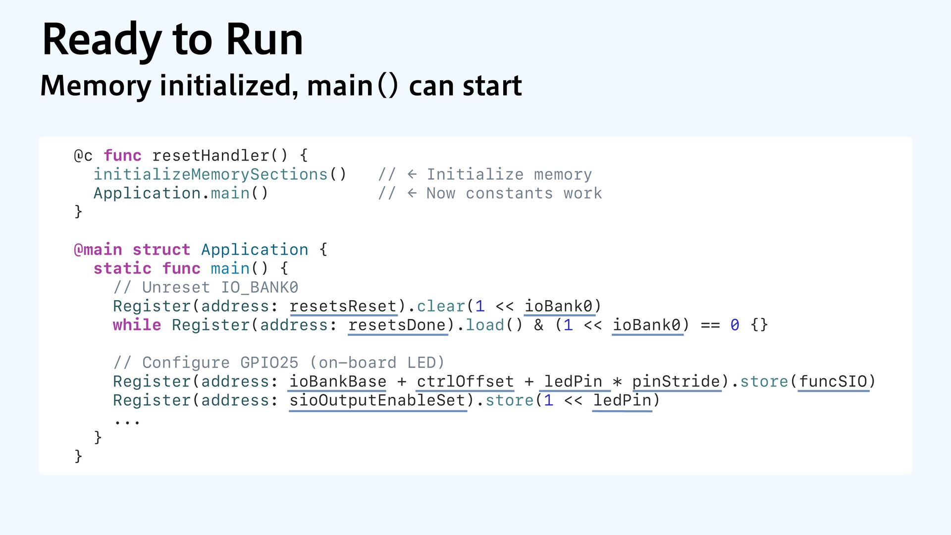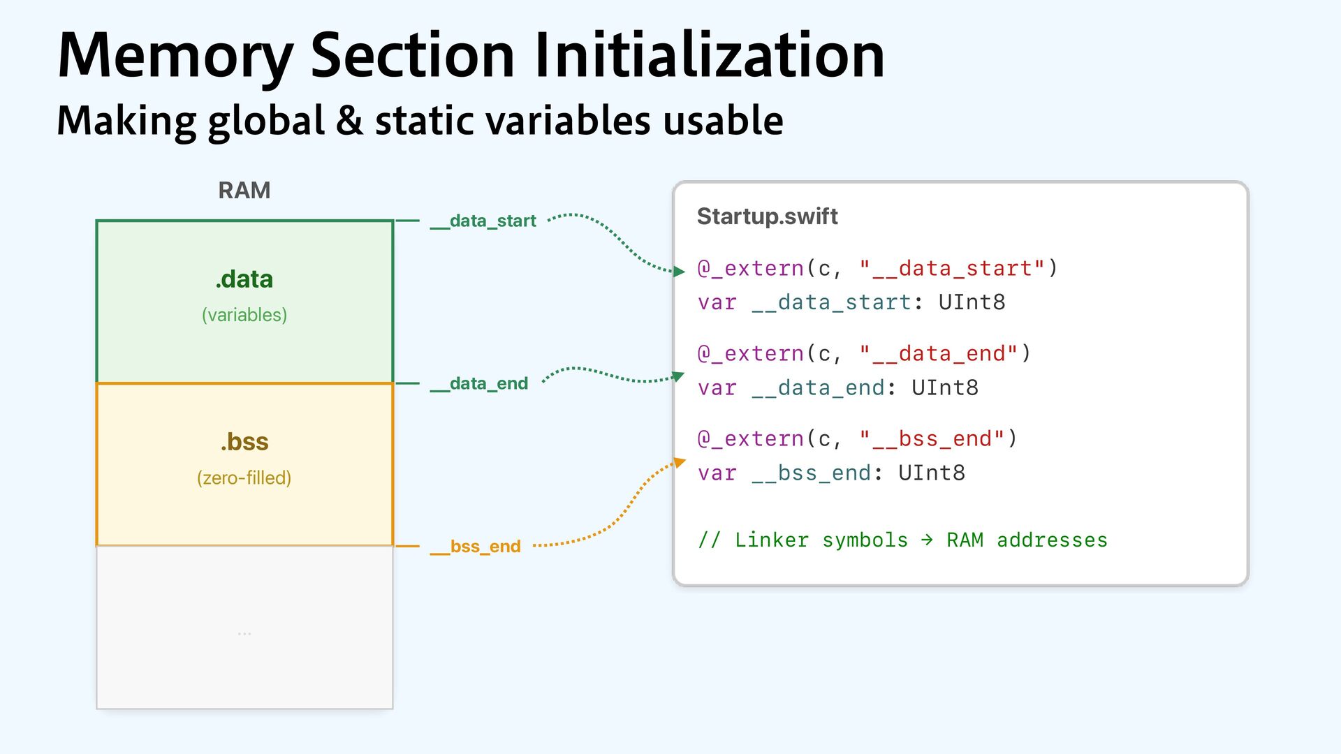 to RAM var src = dataOrigin var dst = dataStart while dst != dataEnd { dst.pointee = src.pointee dst = dst.advanced(by: 1) src = src.advanced(by: 1) } // Zero out the rest while dst != bssEnd { dst.pointee = 0 dst = dst.advanced(by: 1) } } JOJUJBMJ[F.FNPSZ4FDUJPOT $PQZBOE[FSP fi MM @_extern(c, "__data_origin") var __data_origin: UInt8 @_extern(c, "__data_start") var __data_start: UInt8 @_extern(c, "__data_end") var __data_end: UInt8 @_extern(c, "__bss_end") var __bss_end: UInt8