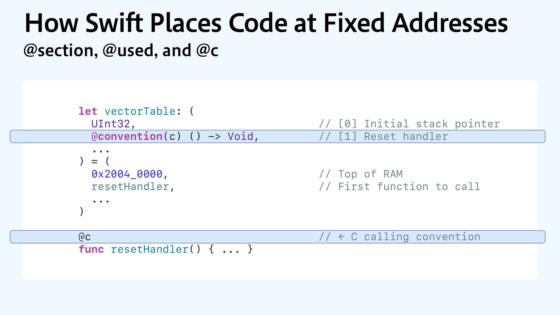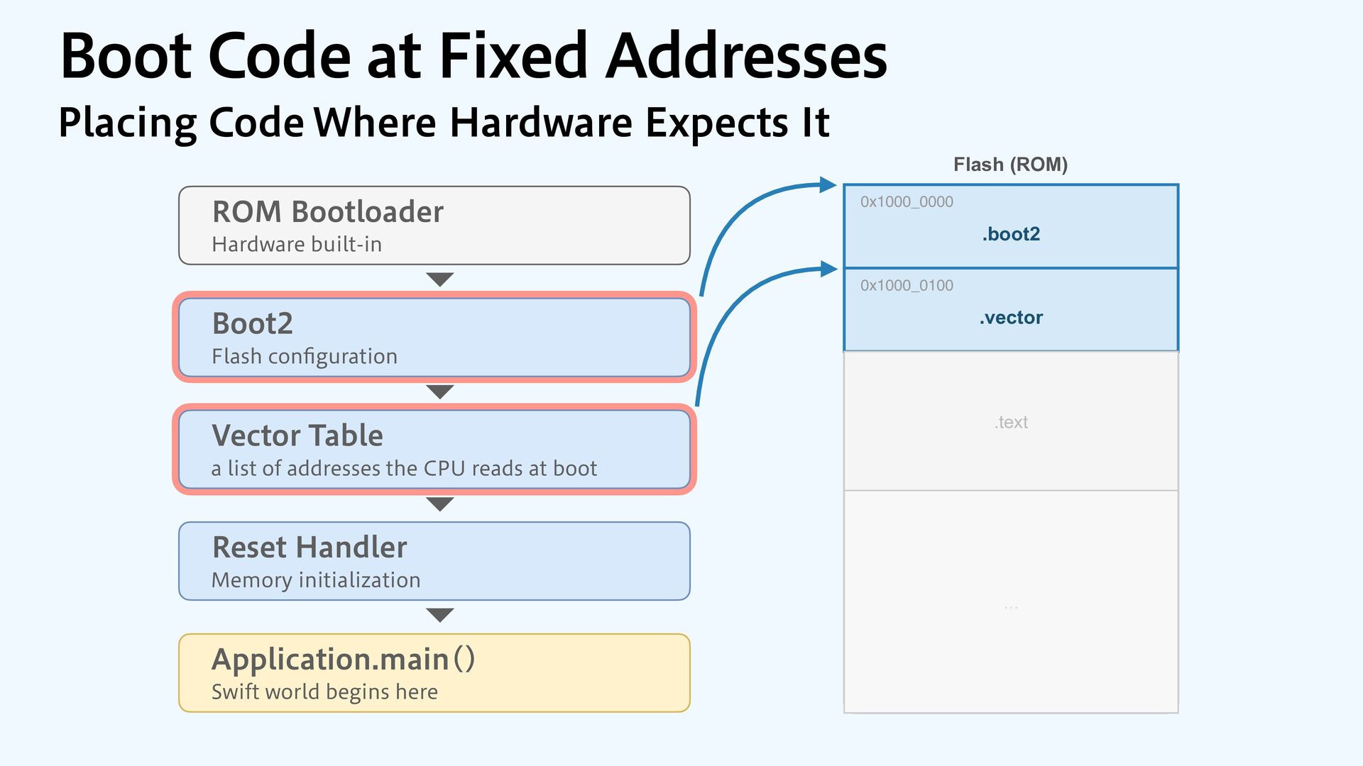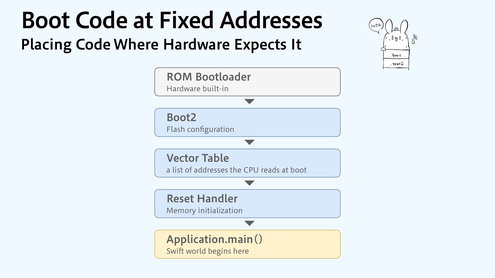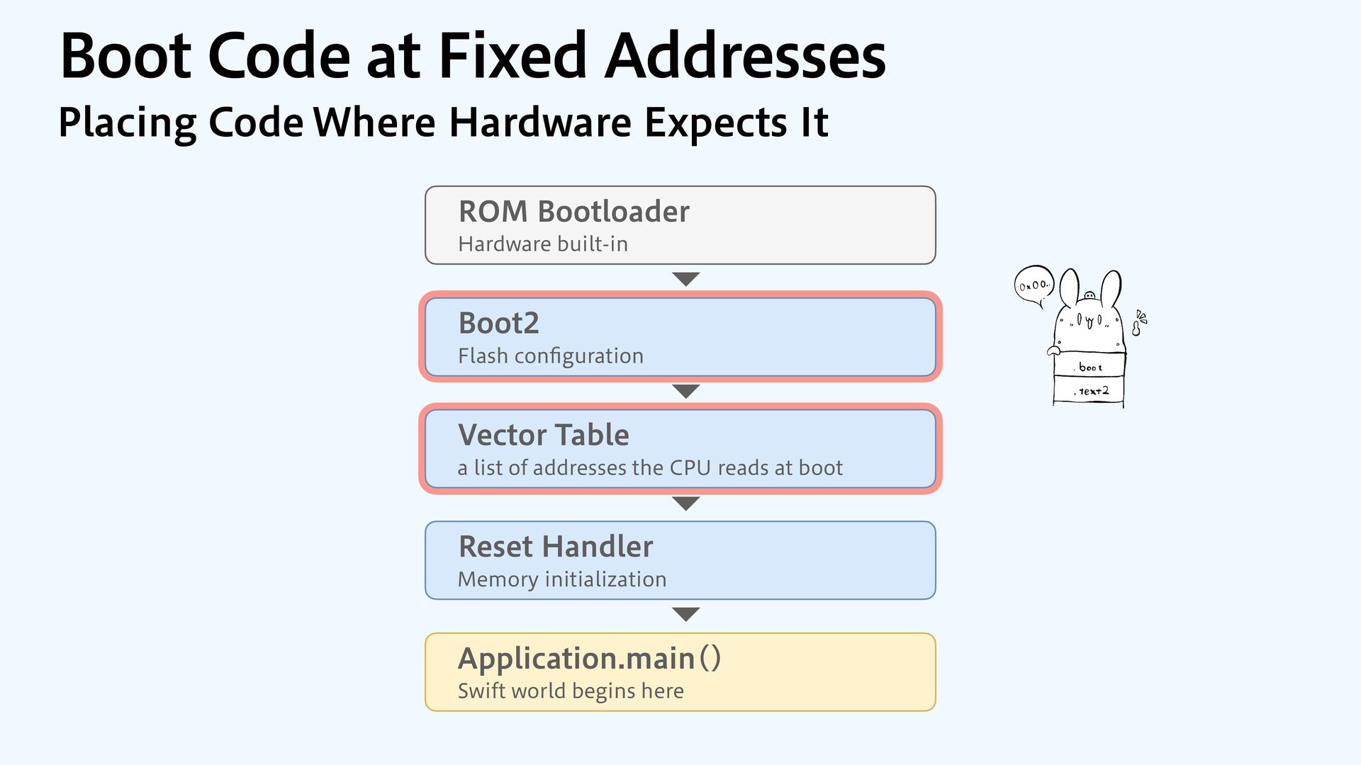 to RAM var src = dataOrigin var dst = dataStart while dst != dataEnd { dst.pointee = src.pointee dst = dst.advanced(by: 1) src = src.advanced(by: 1) } // Zero out the rest while dst != bssEnd { dst.pointee = 0 dst = dst.advanced(by: 1) } } JOJUJBMJ[F.FNPSZ4FDUJPOT $PQZBOE[FSP fi MM @_extern(c, "__data_origin") var __data_origin: UInt8 @_extern(c, "__data_start") var __data_start: UInt8 @_extern(c, "__data_end") var __data_end: UInt8 @_extern(c, "__bss_end") var __bss_end: UInt8