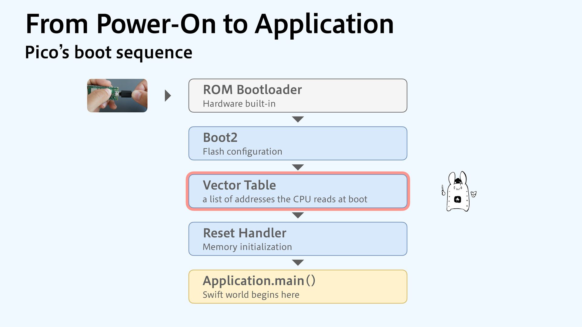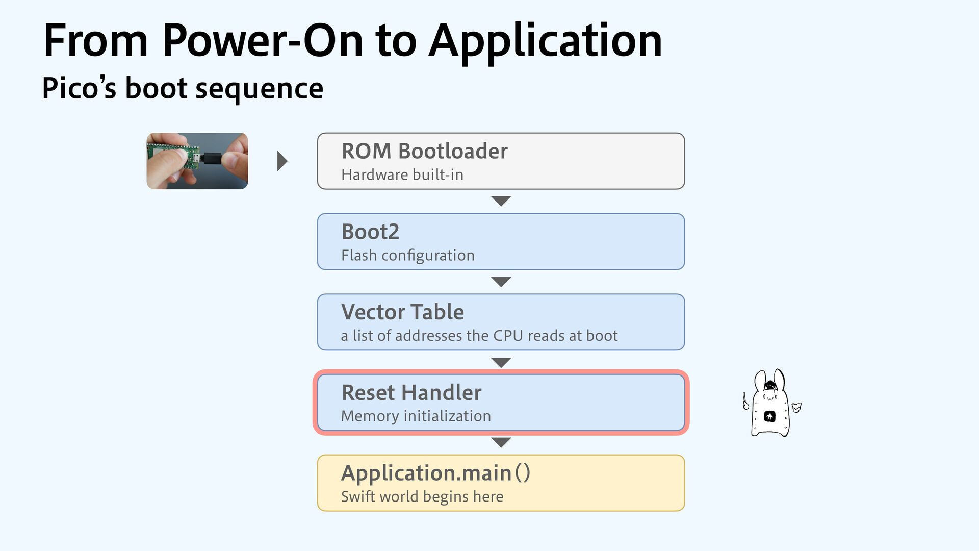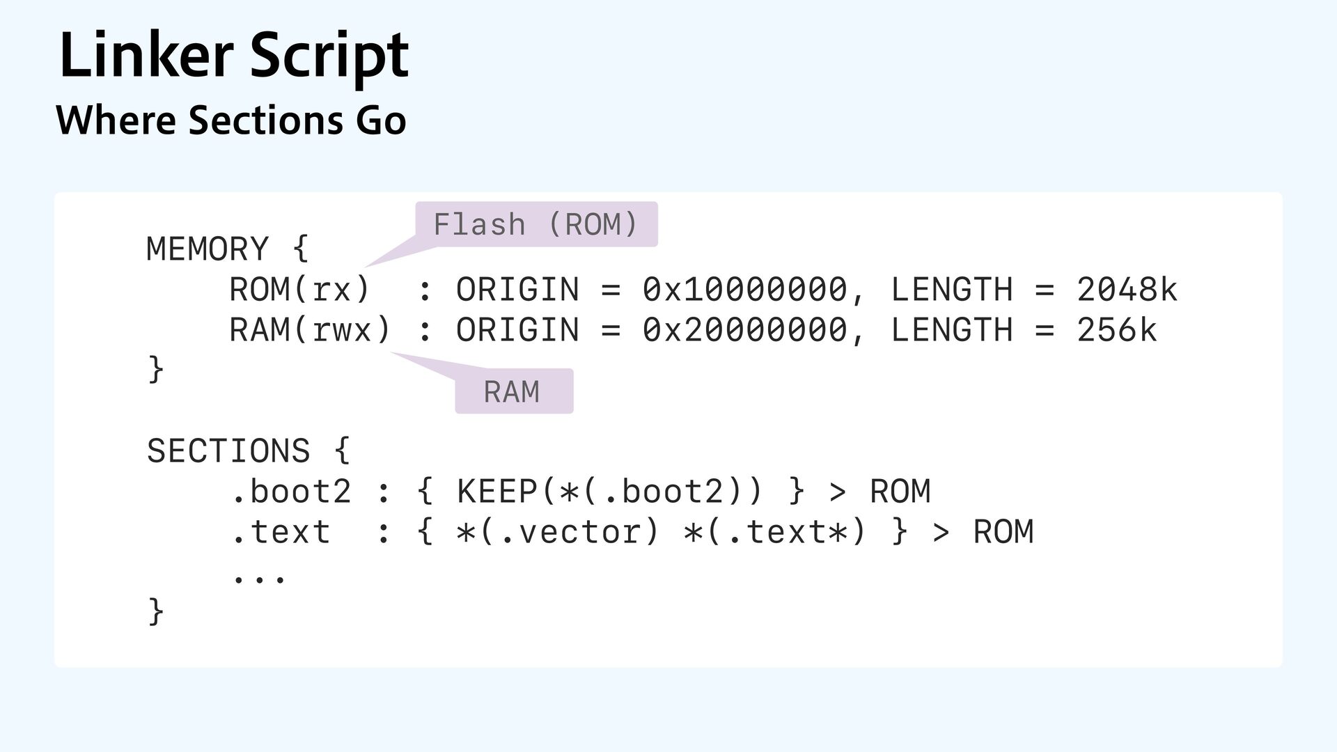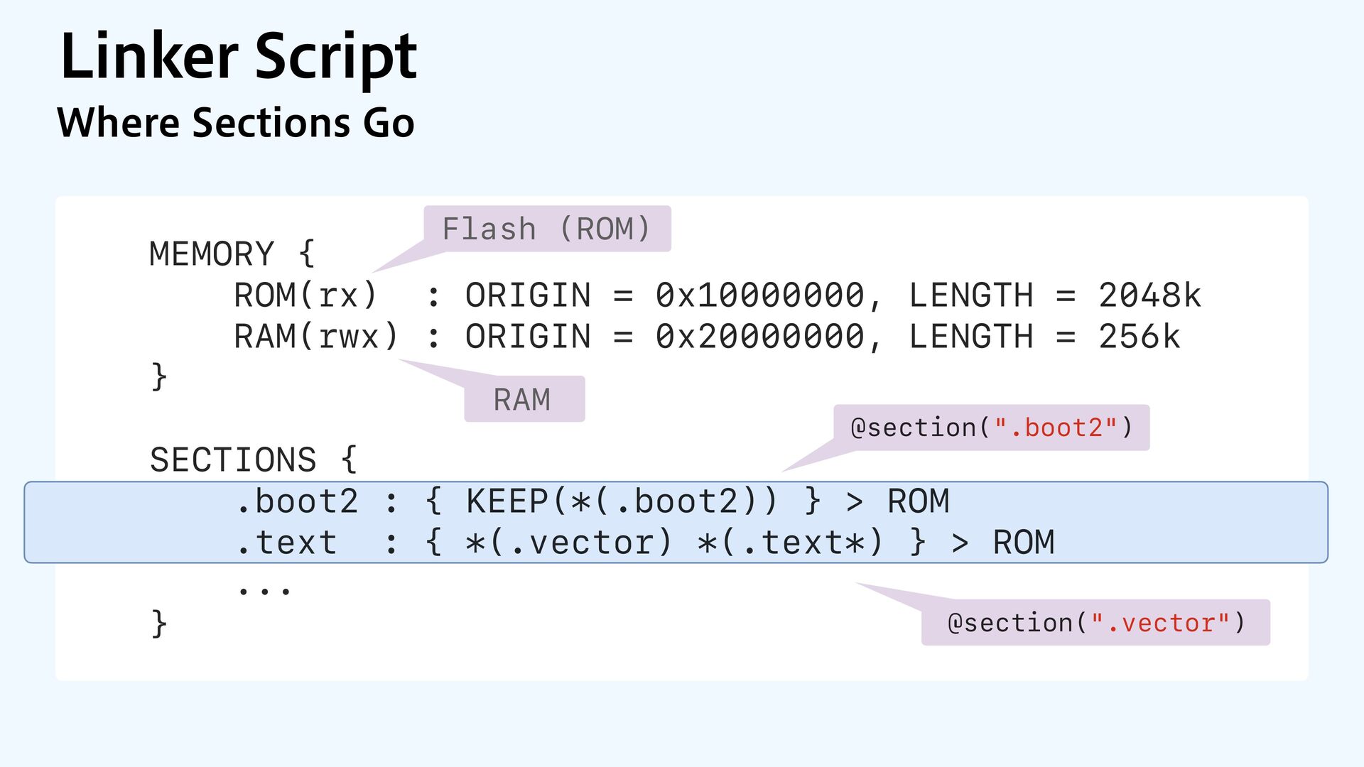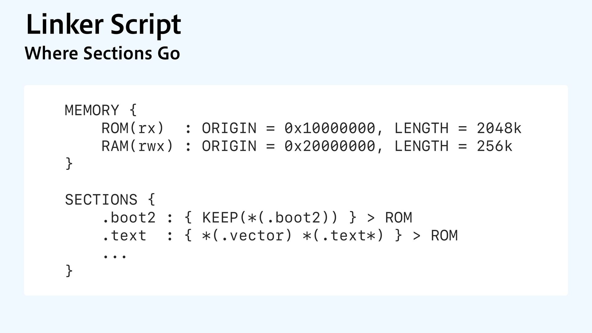 to RAM var src = dataOrigin var dst = dataStart while dst != dataEnd { dst.pointee = src.pointee dst = dst.advanced(by: 1) src = src.advanced(by: 1) } // Zero out the rest while dst != bssEnd { dst.pointee = 0 dst = dst.advanced(by: 1) } } JOJUJBMJ[F.FNPSZ4FDUJPOT $PQZBOE[FSP fi MM @_extern(c, "__data_origin") var __data_origin: UInt8 @_extern(c, "__data_start") var __data_start: UInt8 @_extern(c, "__data_end") var __data_end: UInt8 @_extern(c, "__bss_end") var __bss_end: UInt8
