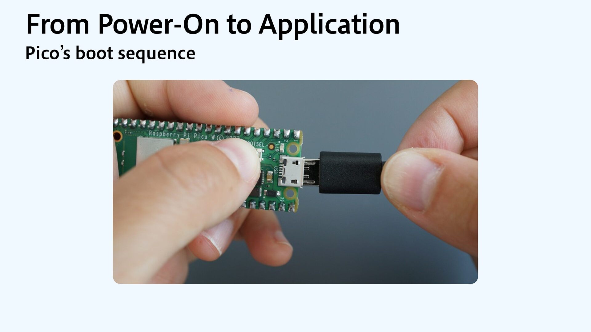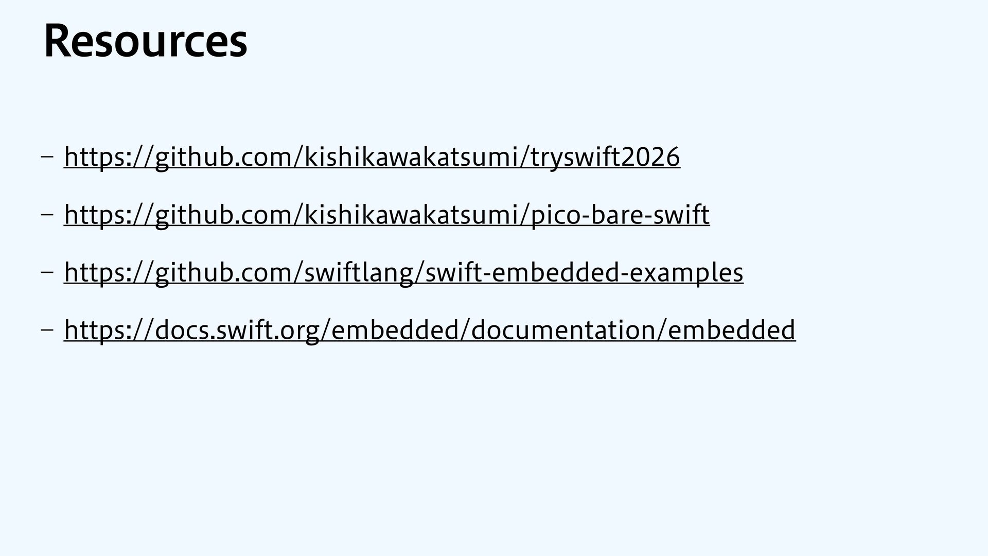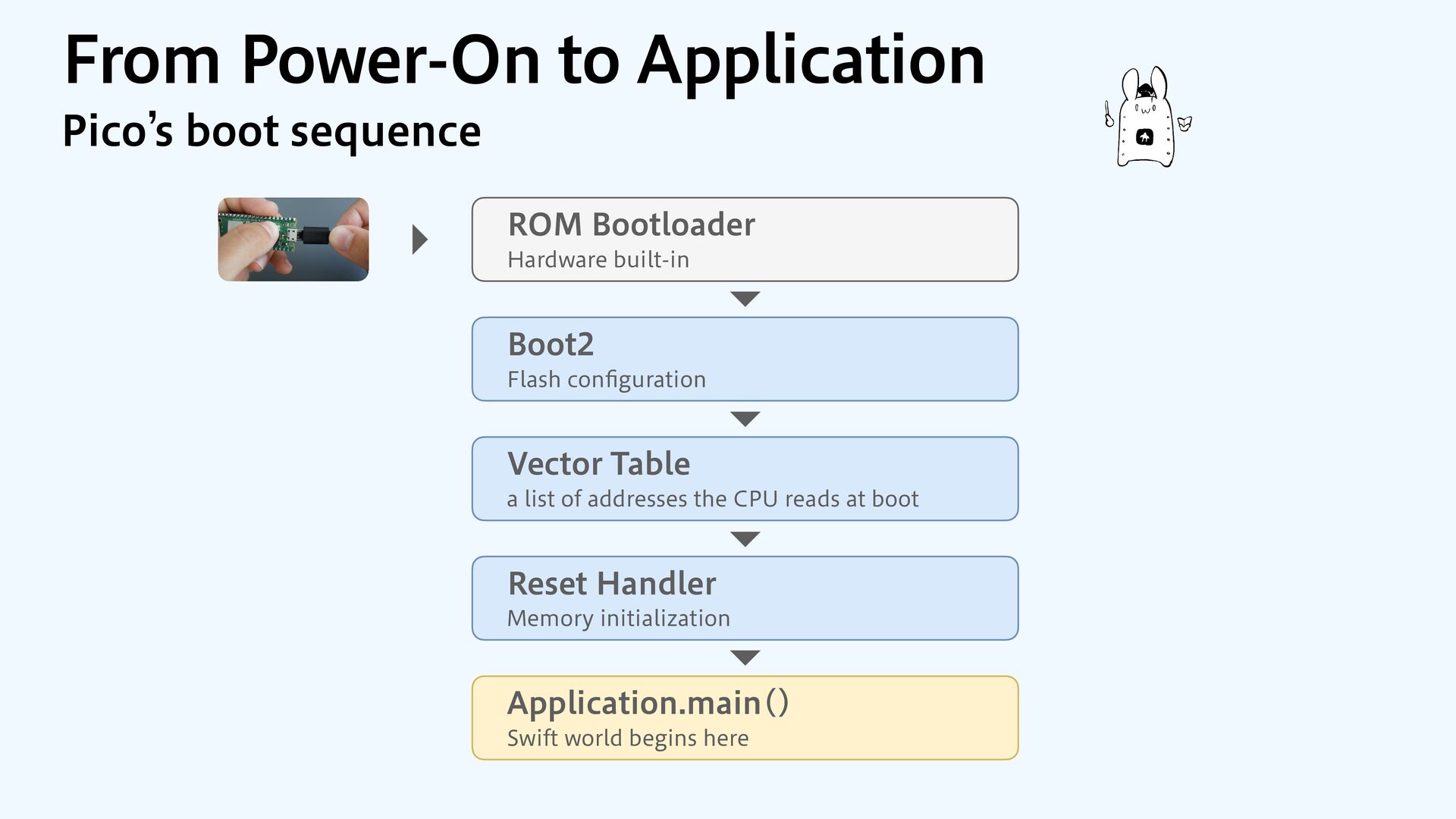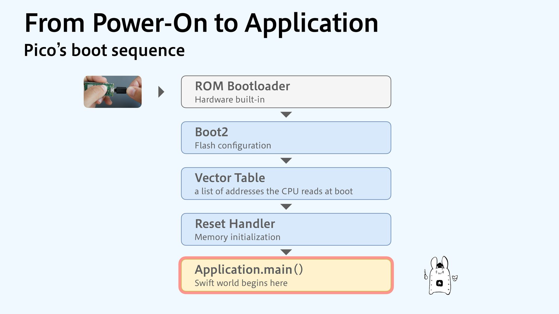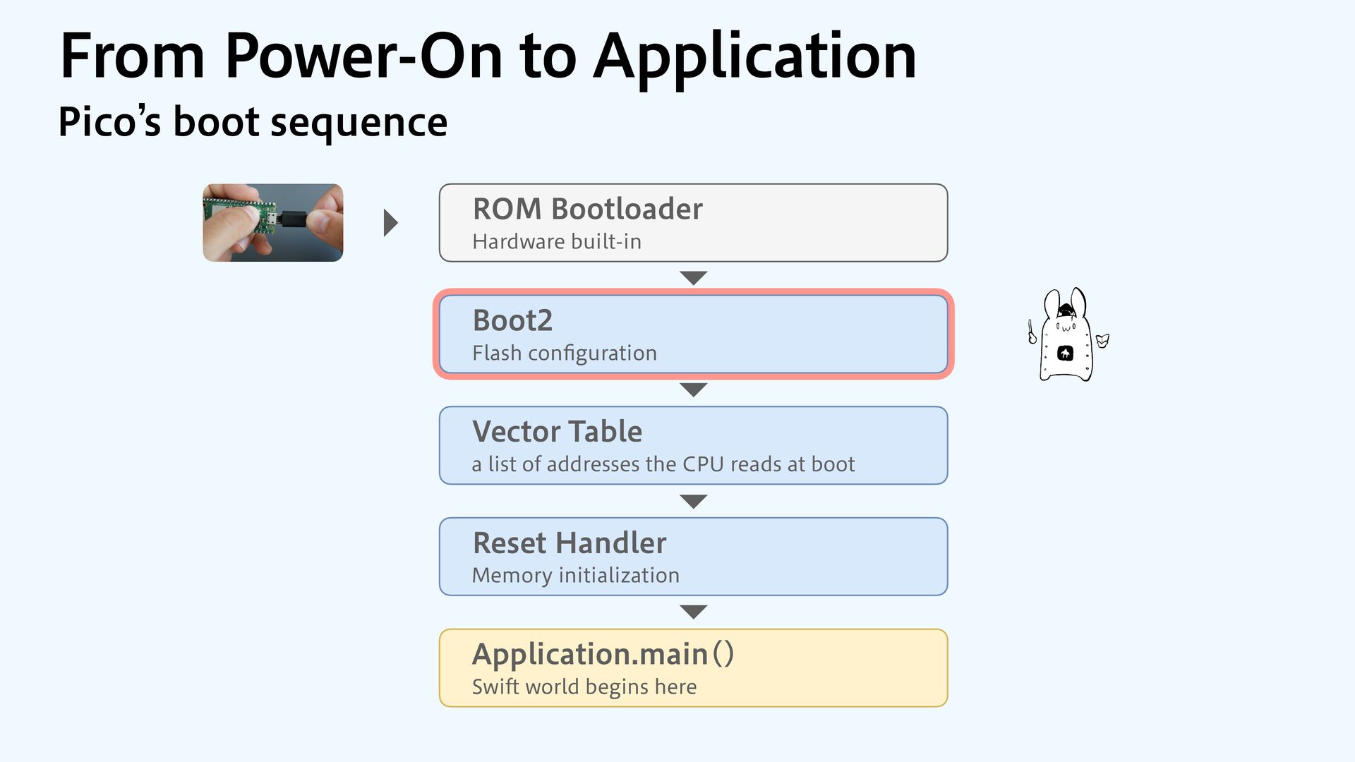 to RAM var src = dataOrigin var dst = dataStart while dst != dataEnd { dst.pointee = src.pointee dst = dst.advanced(by: 1) src = src.advanced(by: 1) } // Zero out the rest while dst != bssEnd { dst.pointee = 0 dst = dst.advanced(by: 1) } } JOJUJBMJ[F.FNPSZ4FDUJPOT $PQZBOE[FSP fi MM @_extern(c, "__data_origin") var __data_origin: UInt8 @_extern(c, "__data_start") var __data_start: UInt8 @_extern(c, "__data_end") var __data_end: UInt8 @_extern(c, "__bss_end") var __bss_end: UInt8