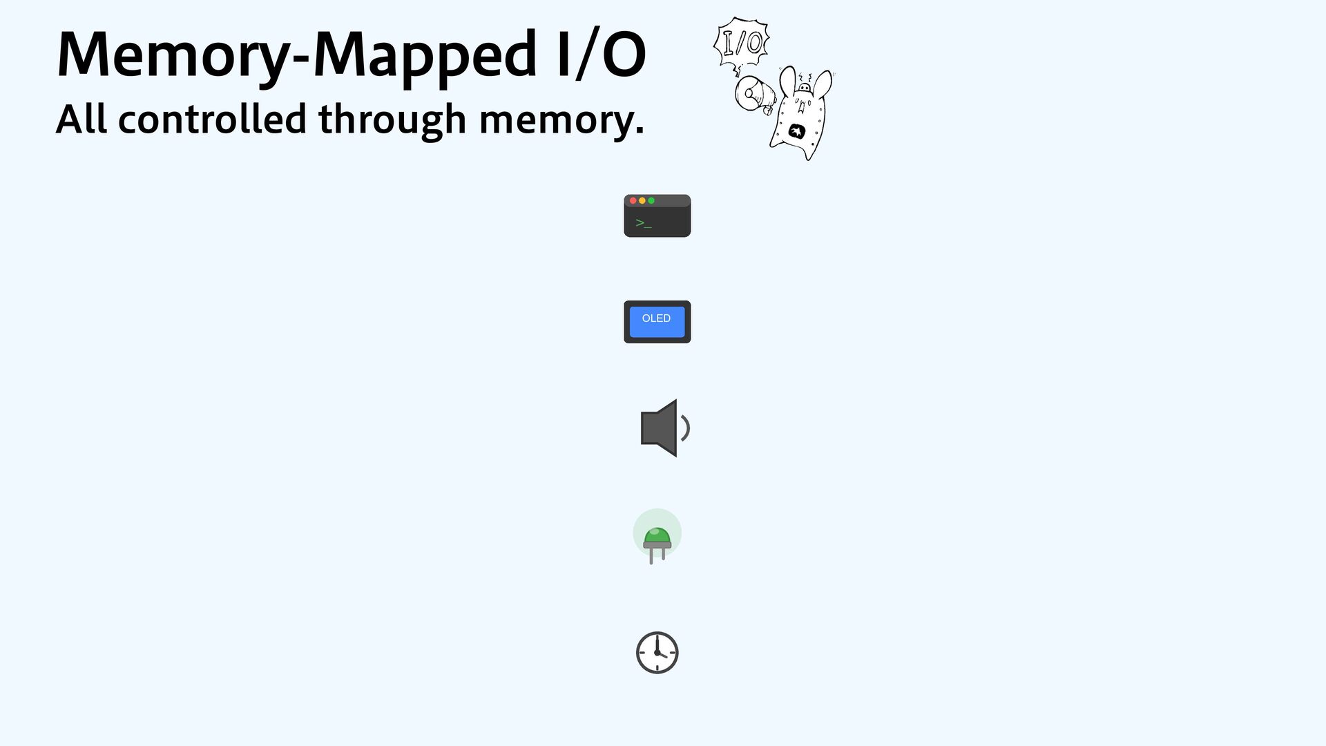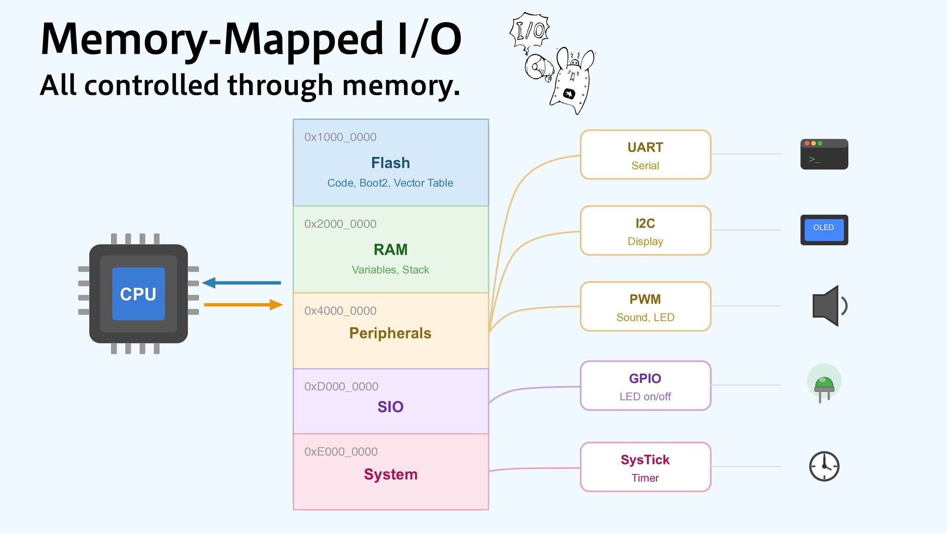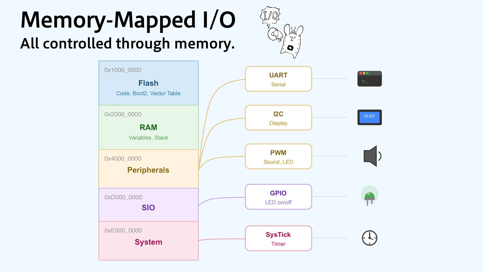 0x4000_0000 Peripherals 0xD000_0000 SIO 0xE000_0000 System UART Serial I2C Display PWM Sound, LED GPIO LED on/off SysTick Timer .FNPSZ.BQQFE*0 "MMDPOUSPMMFEUISPVHINFNPSZ >_ OLED CPU