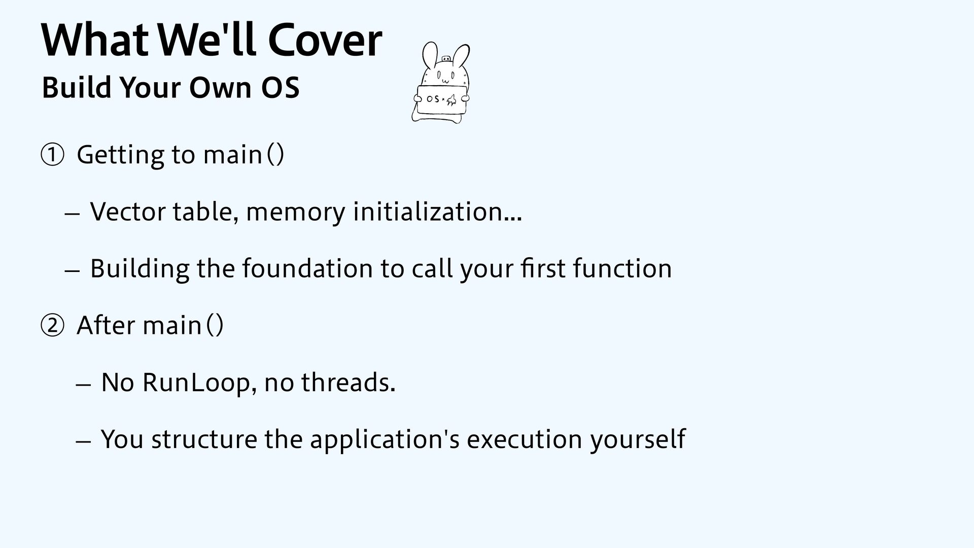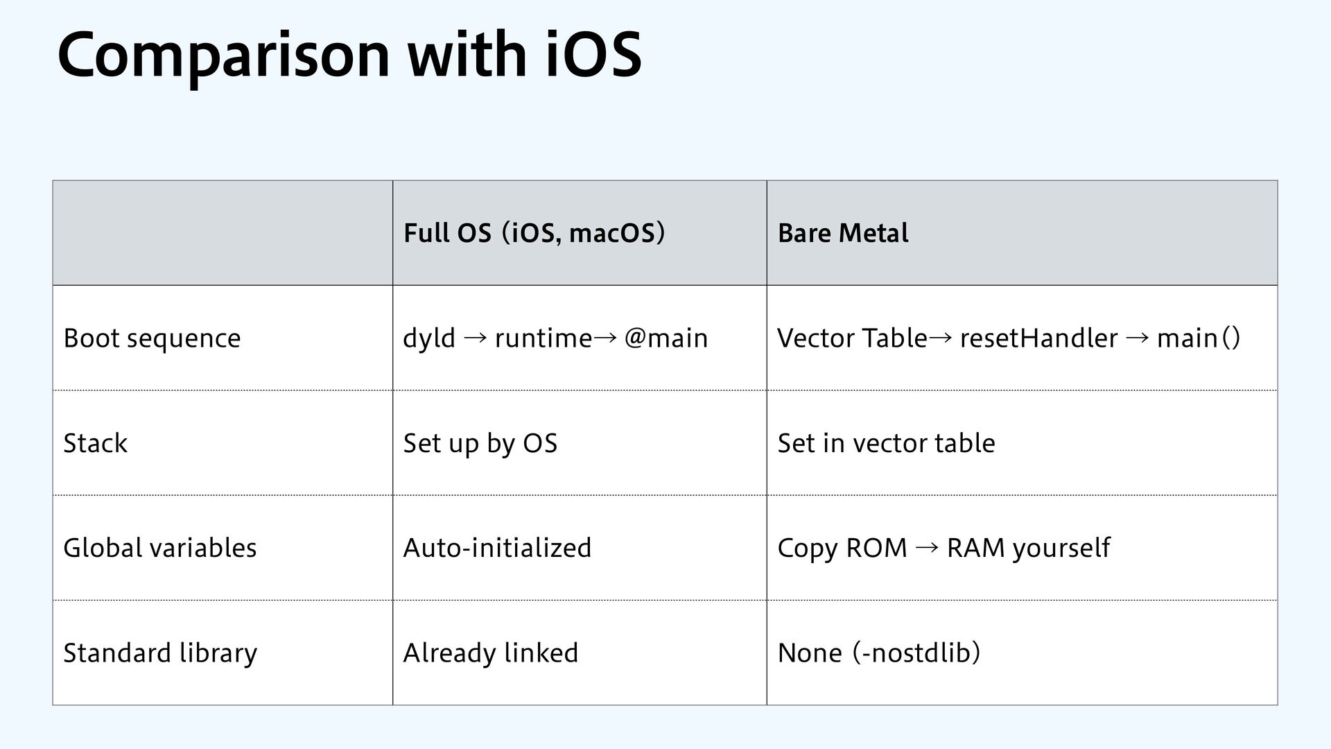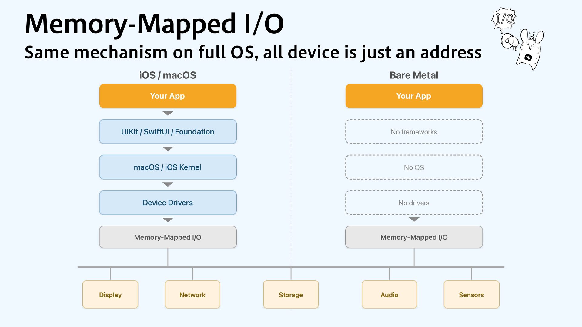 SwiftUI / Foundation macOS / iOS Kernel Device Drivers Memory-Mapped I/O Bare Metal Your App No frameworks No OS No drivers Memory-Mapped I/O Display Network Storage Audio Sensors