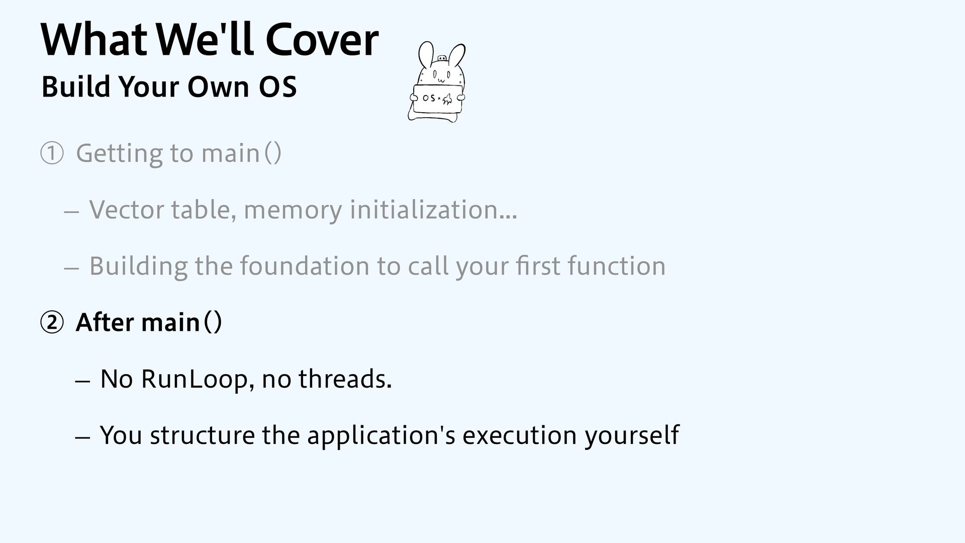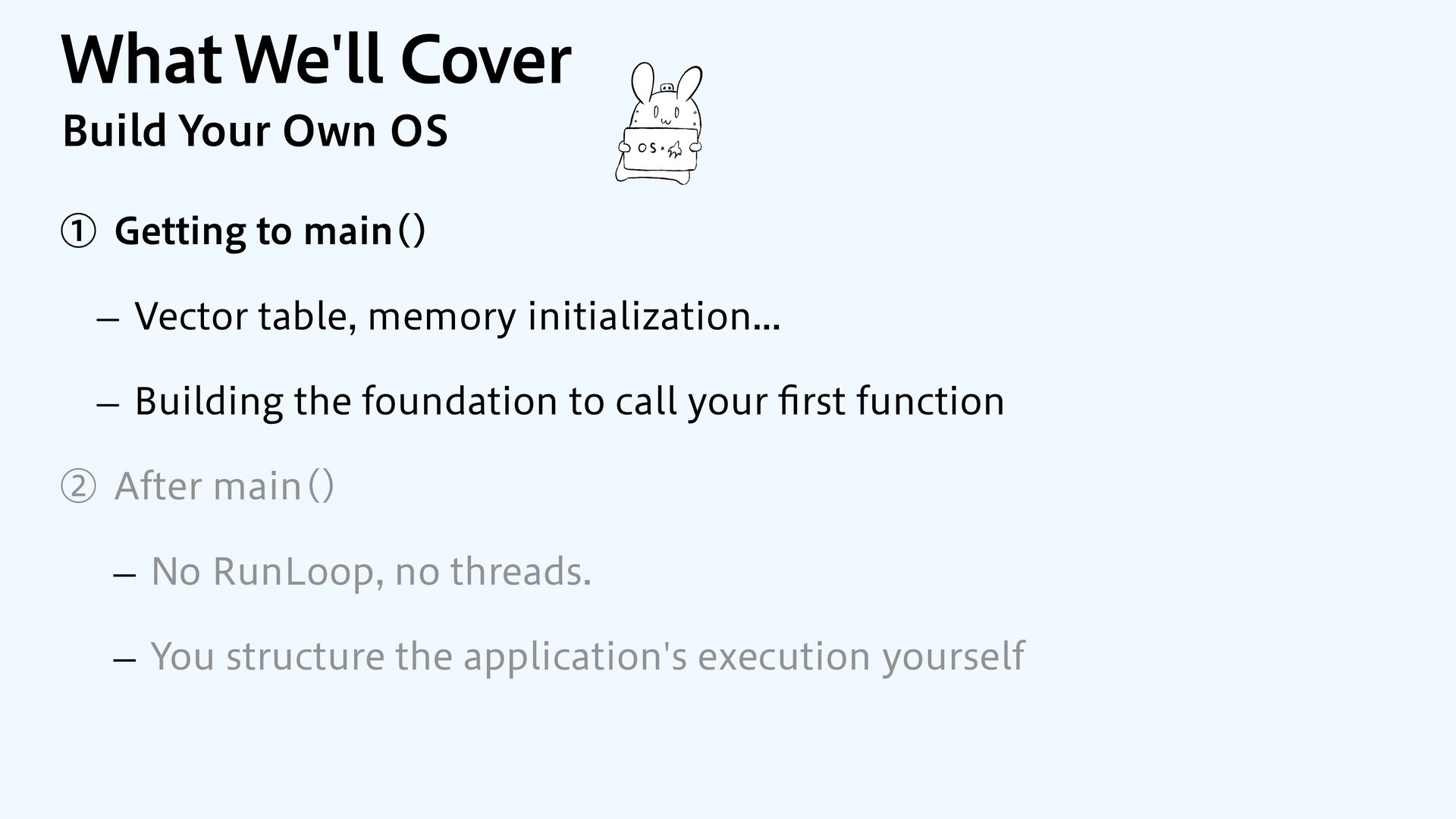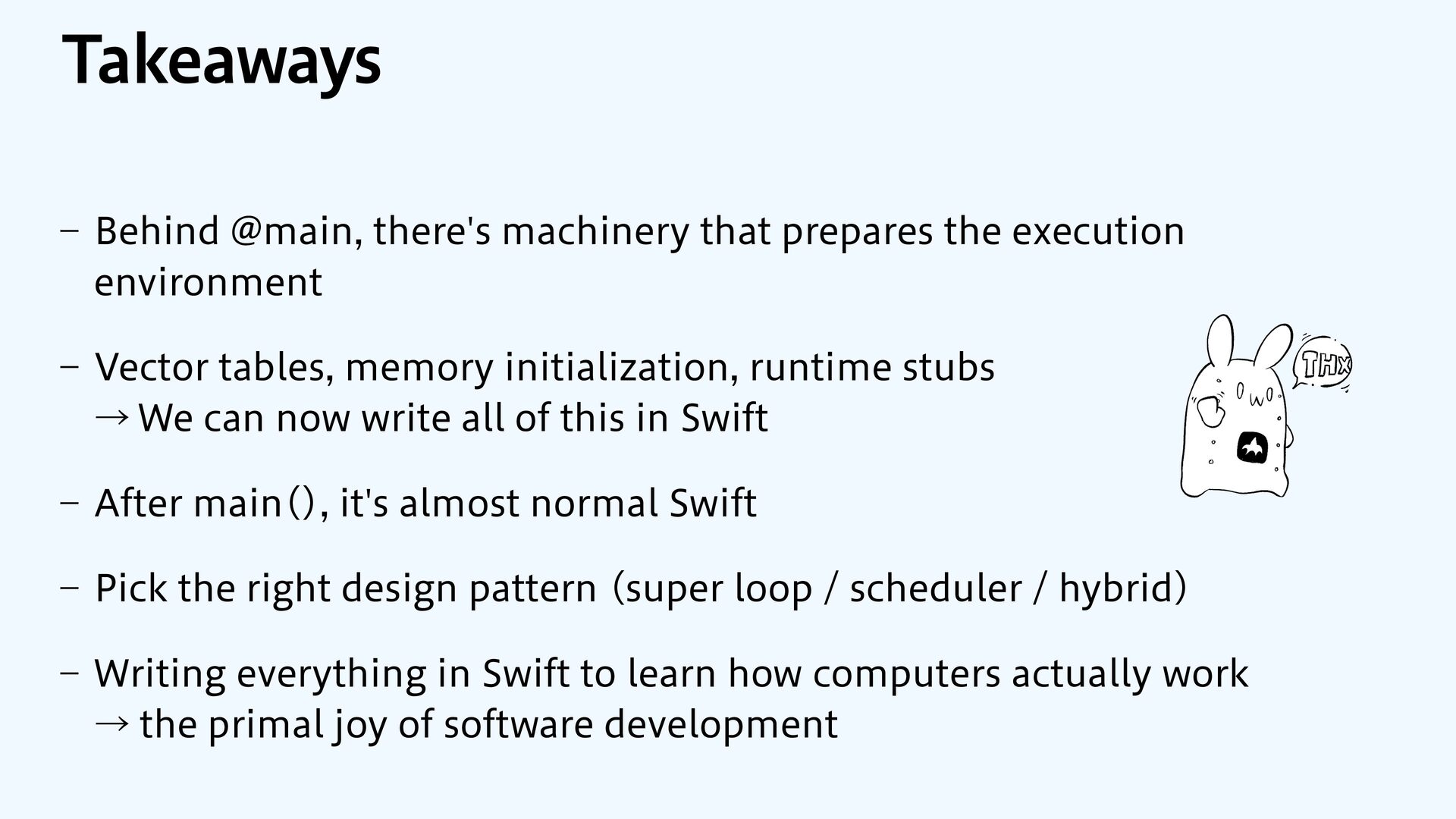 SwiftUI / Foundation macOS / iOS Kernel Device Drivers Memory-Mapped I/O Bare Metal Your App No frameworks No OS No drivers Memory-Mapped I/O Display Network Storage Audio Sensors