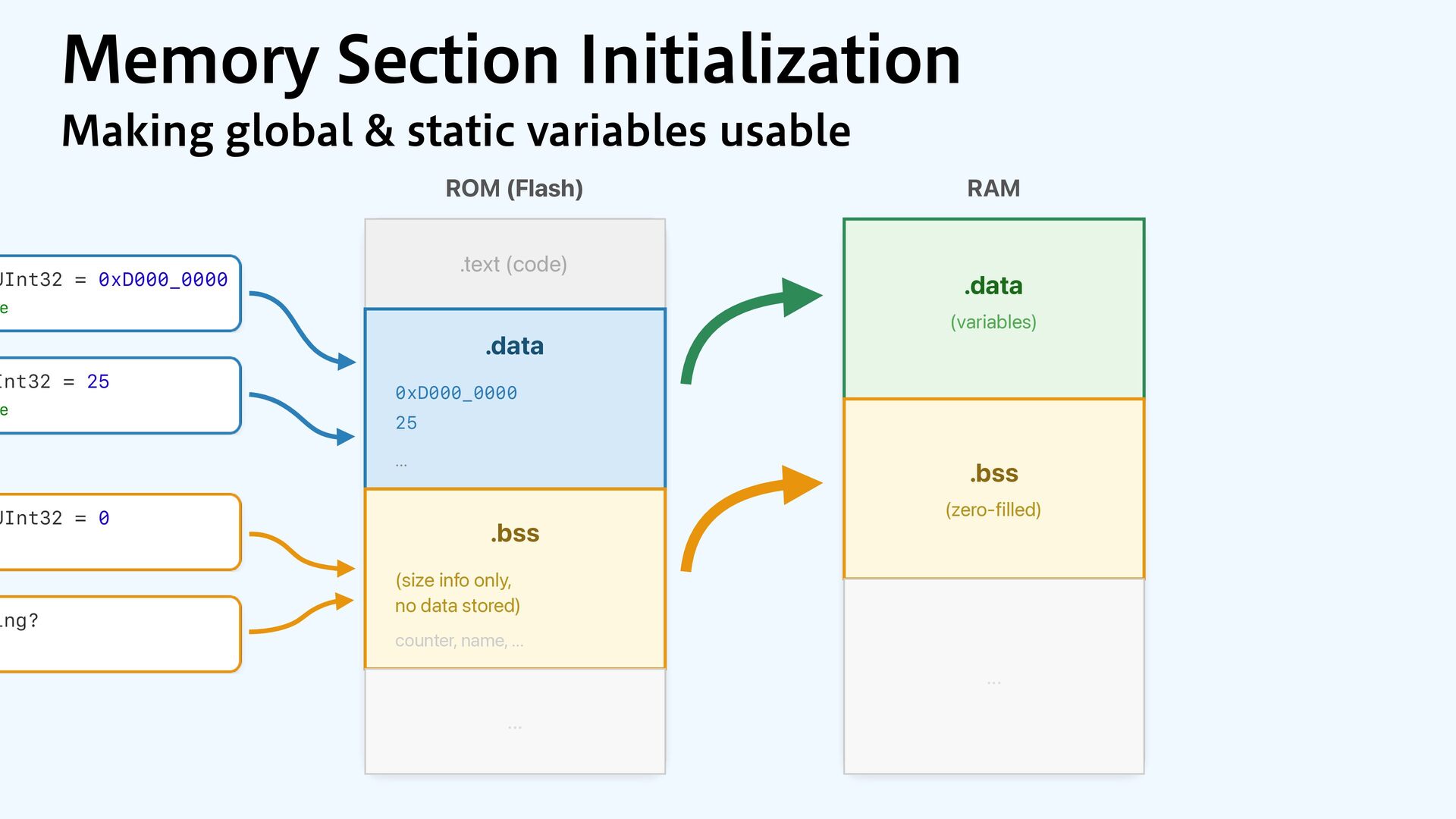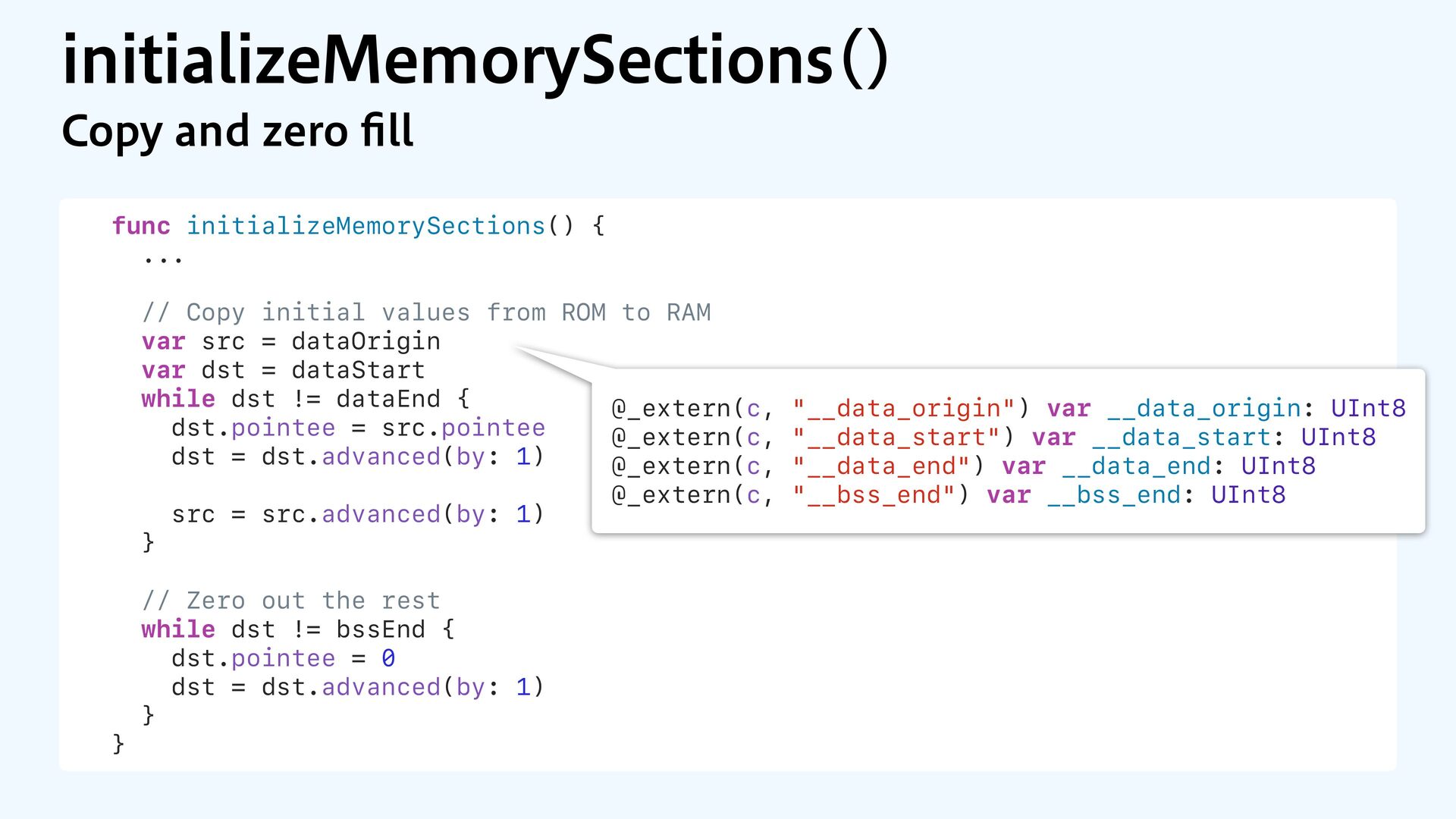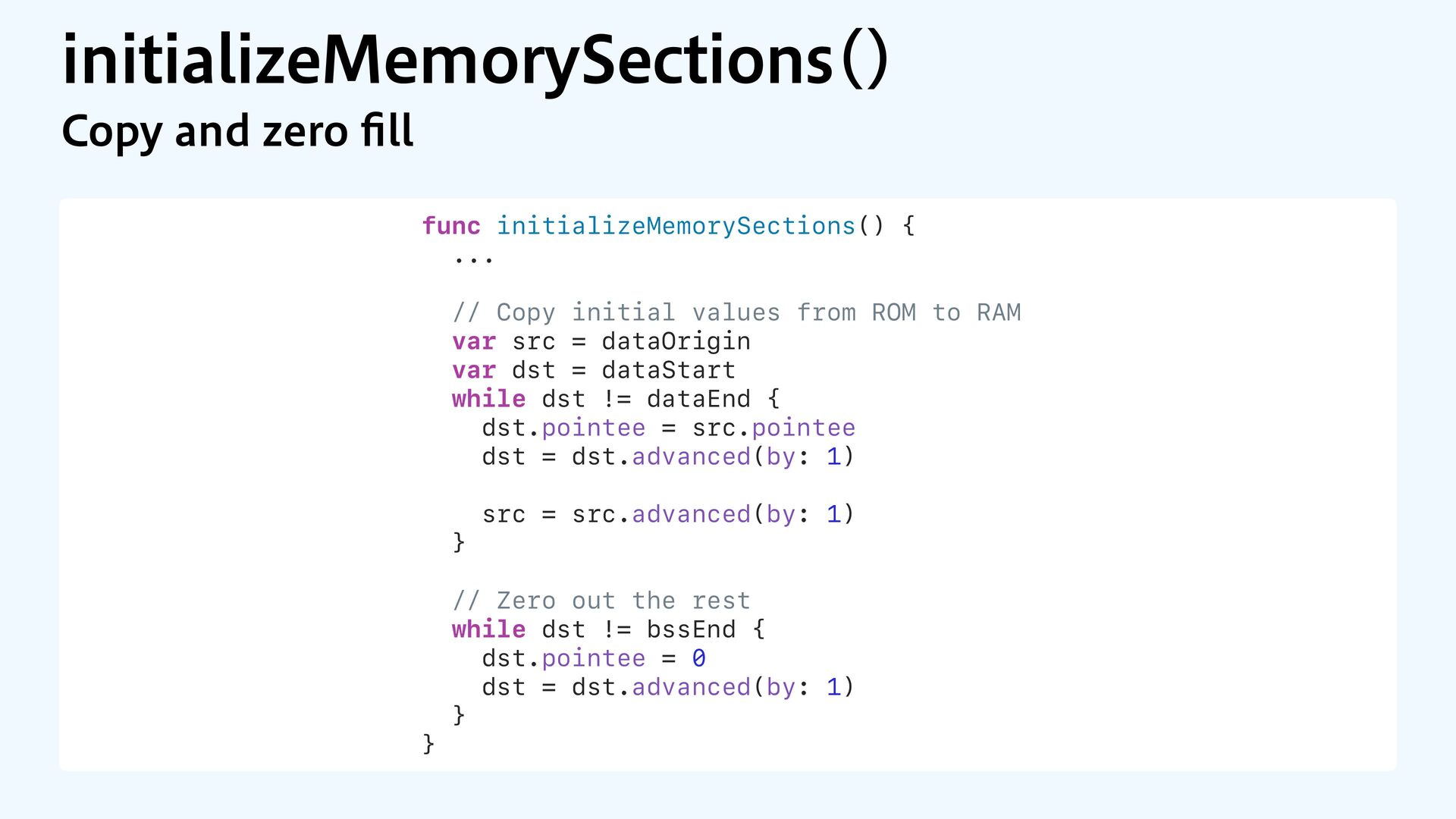 to RAM var src = dataOrigin var dst = dataStart while dst != dataEnd { dst.pointee = src.pointee dst = dst.advanced(by: 1) src = src.advanced(by: 1) } // Zero out the rest while dst != bssEnd { dst.pointee = 0 dst = dst.advanced(by: 1) } } JOJUJBMJ[F.FNPSZ4FDUJPOT $PQZBOE[FSP fi MM