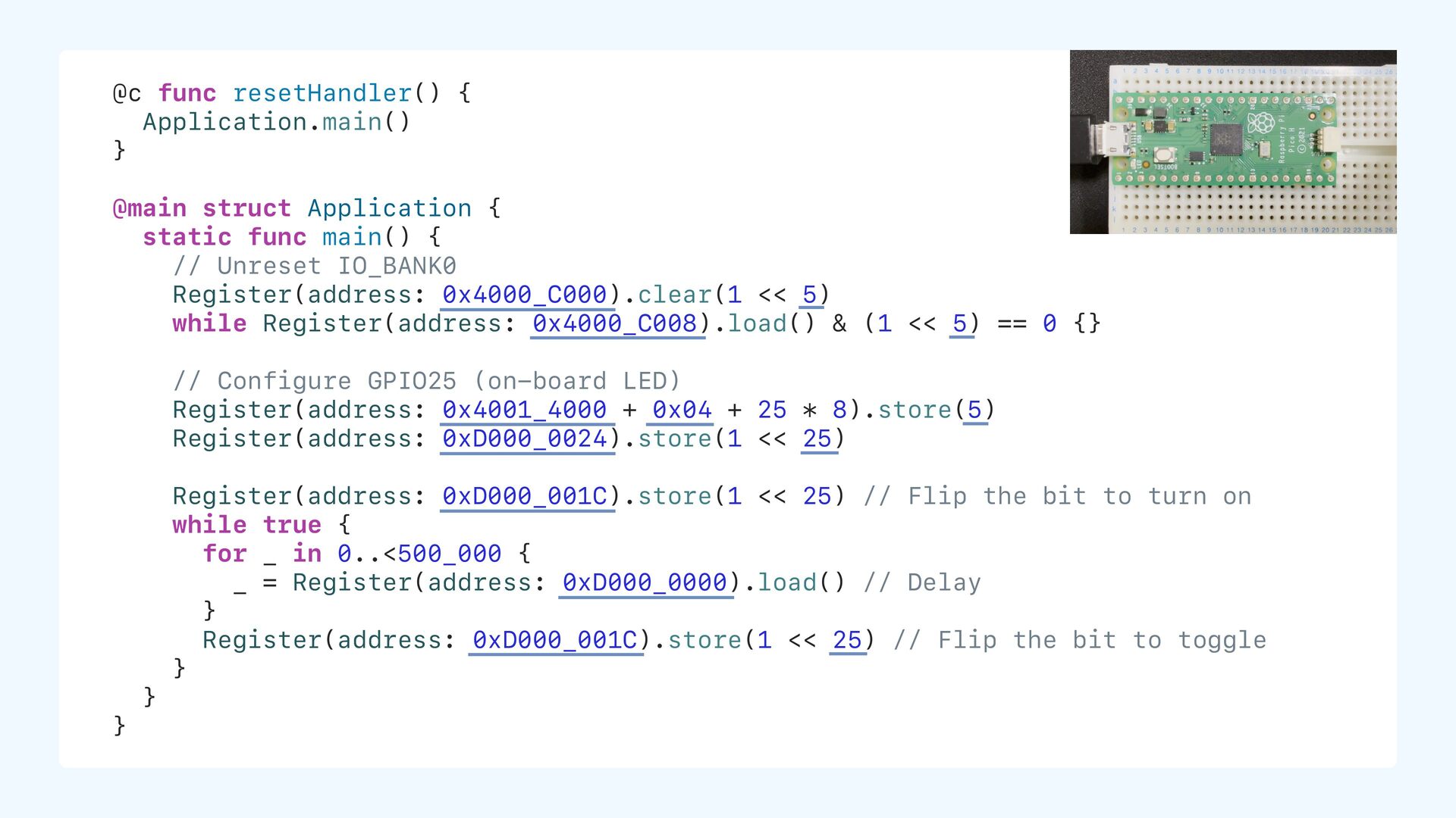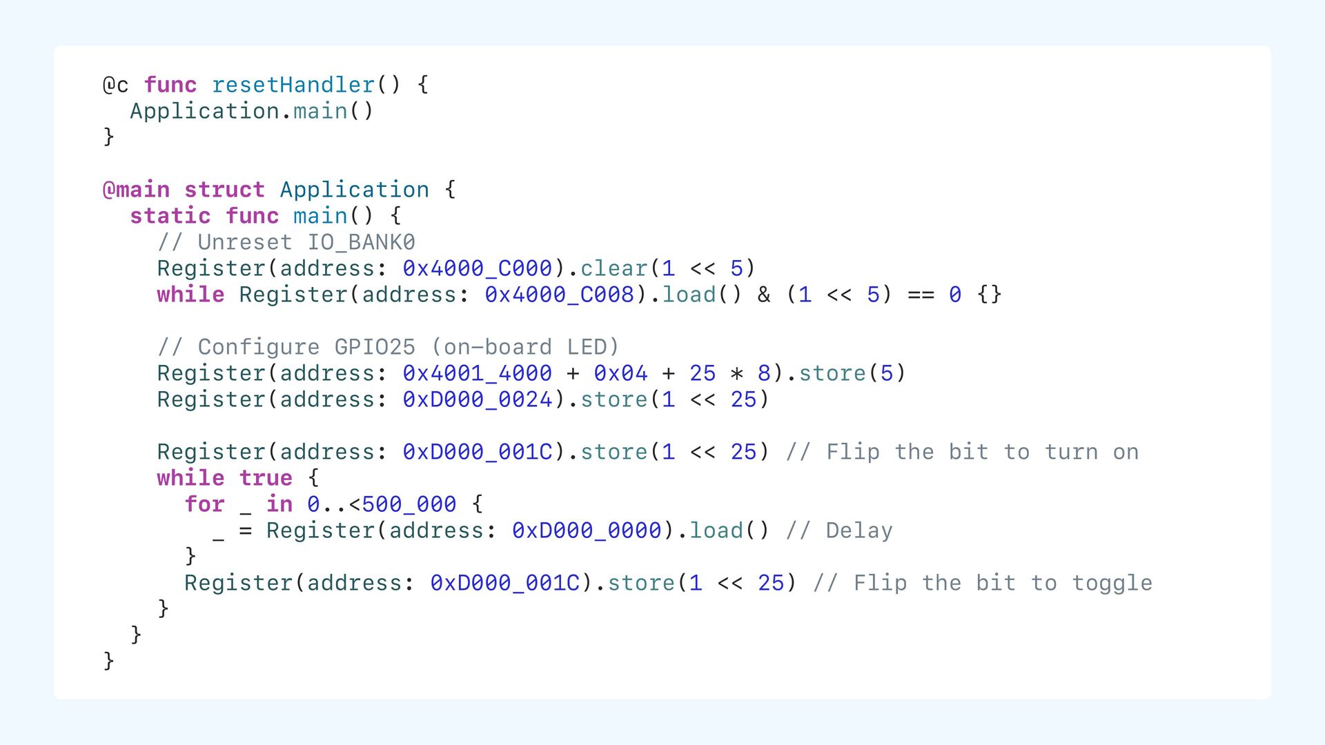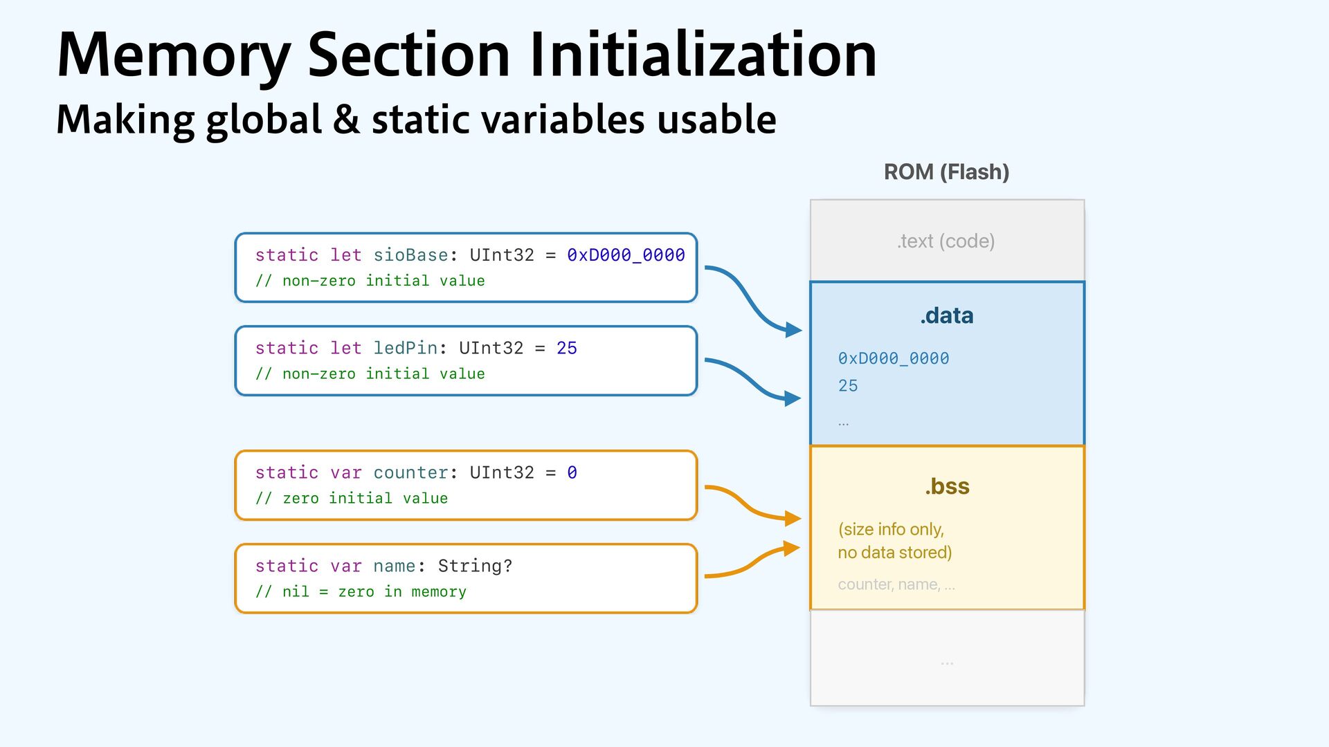 initial value static let ledPin: UInt32 = 25 // non-zero initial value static var counter: UInt32 = 0 // zero initial value static var name: String? // nil = zero in memory ROM (Flash) .text (code) .data 0xD000_0000 25 ... .bss (size info only, no data stored) counter, name, ... ...