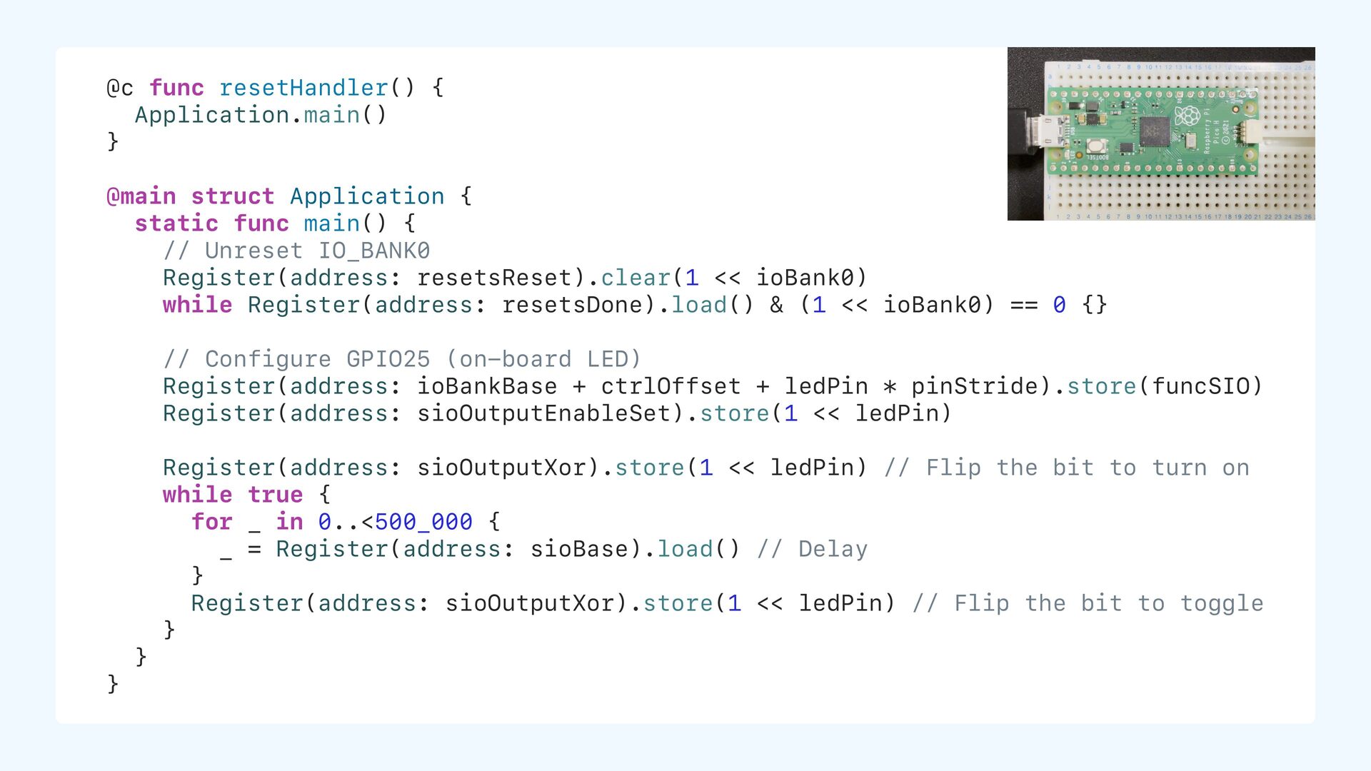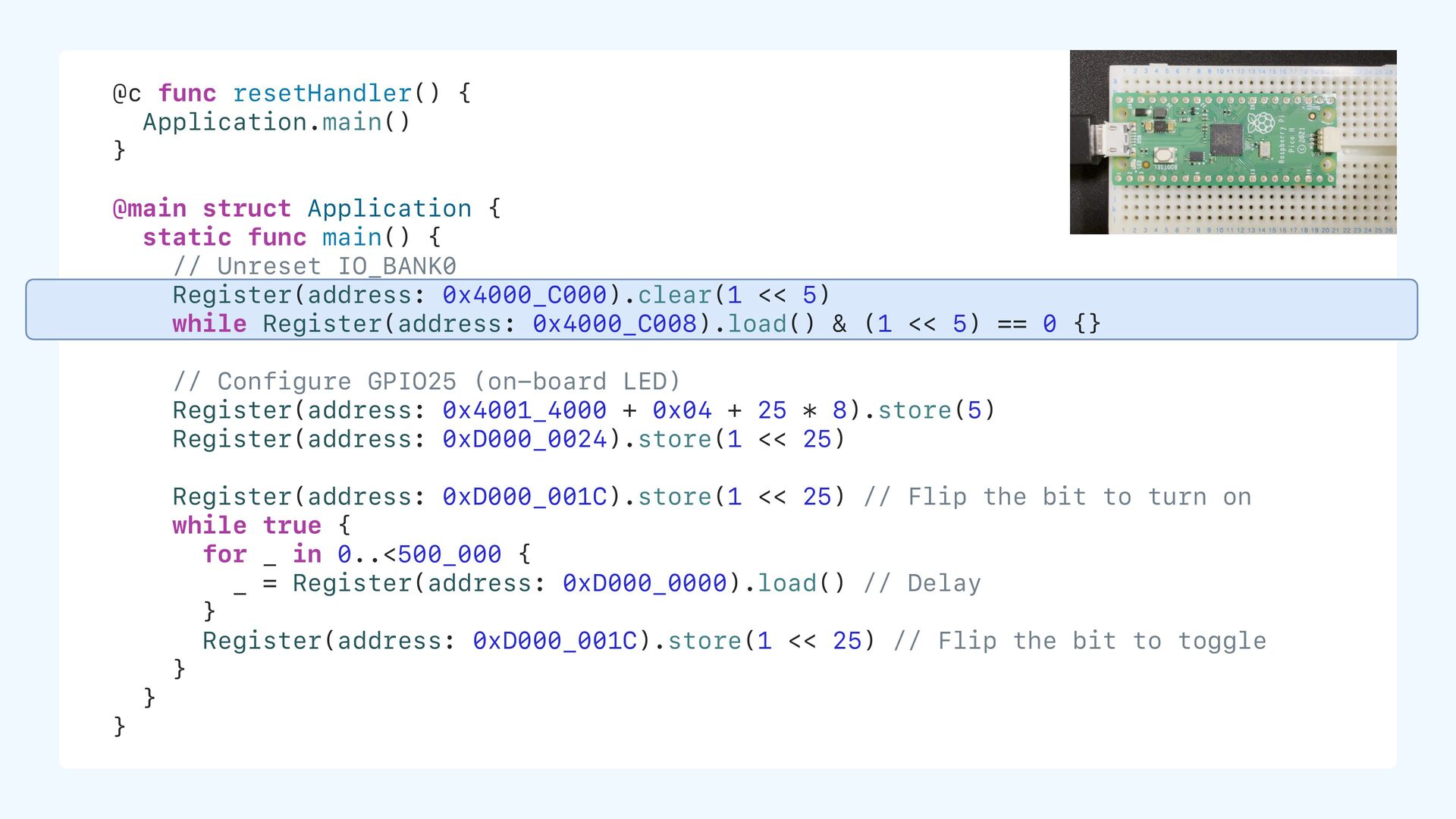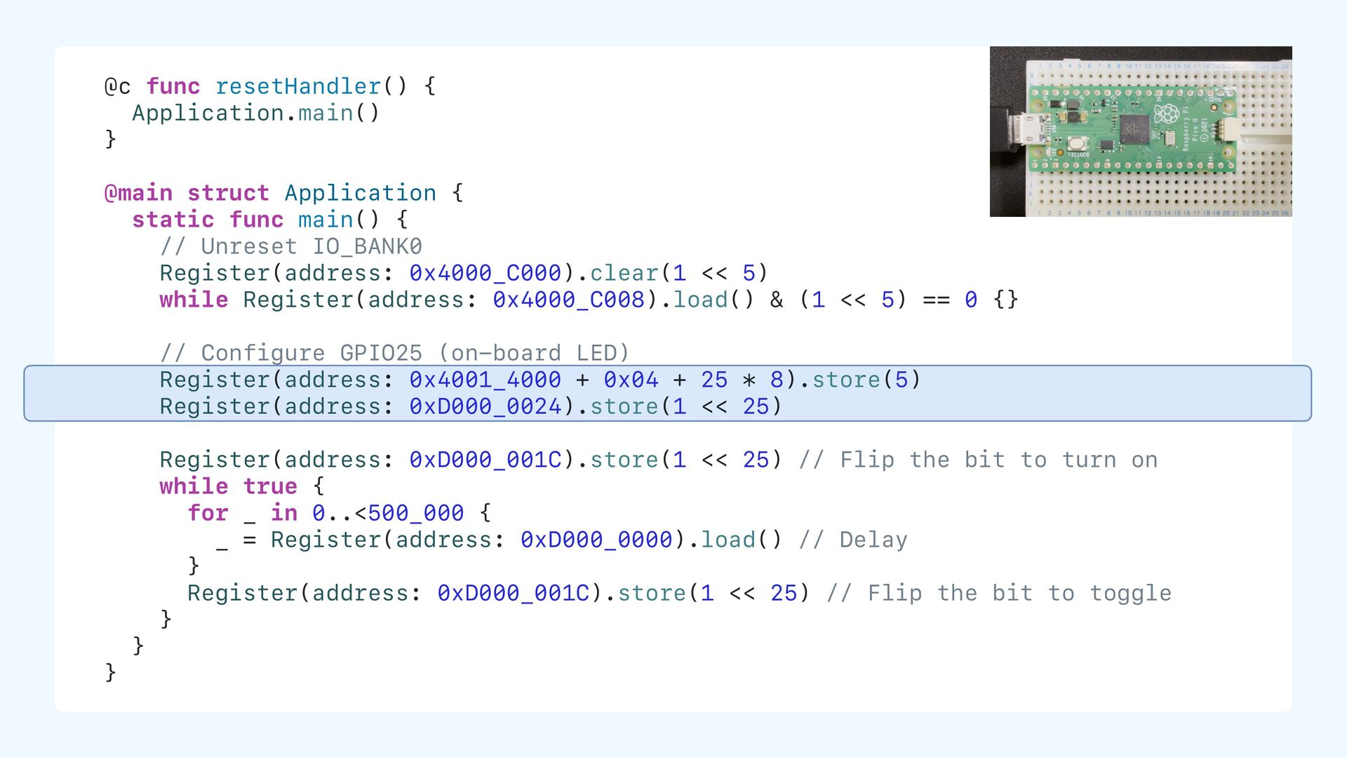 initial value static let ledPin: UInt32 = 25 // non-zero initial value static var counter: UInt32 = 0 // zero initial value static var name: String? // nil = zero in memory ROM (Flash) .text (code) .data 0xD000_0000 25 ... .bss (size info only, no data stored) counter, name, ... ...