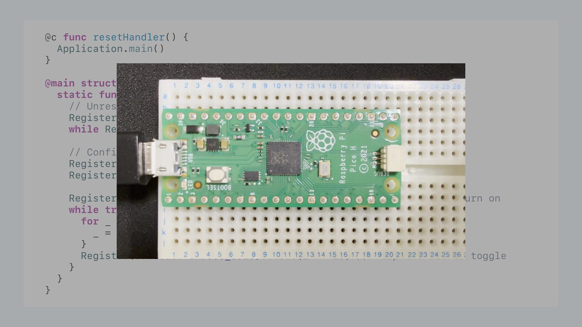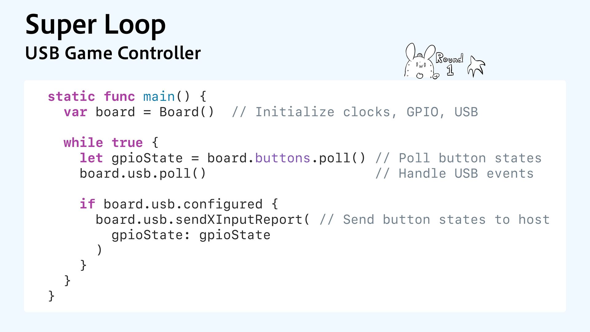 clocks, GPIO, USB while true { let gpioState = board.buttons.poll() // Poll button states board.usb.poll() // Handle USB events if board.usb.configured { board.usb.sendXInputReport( // Send button states to host gpioState: gpioState ) } } } 4VQFS-PPQ 64#(BNF$POUSPMMFS