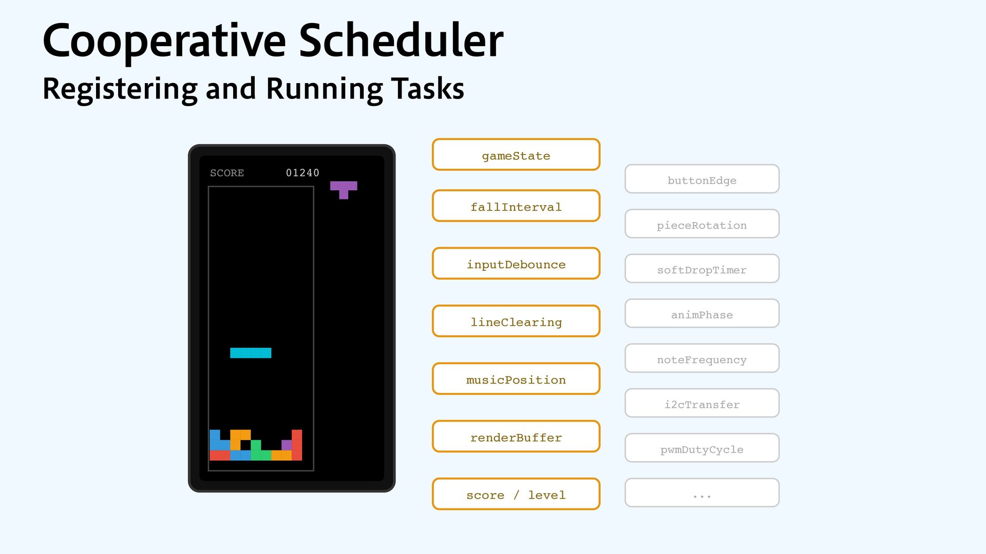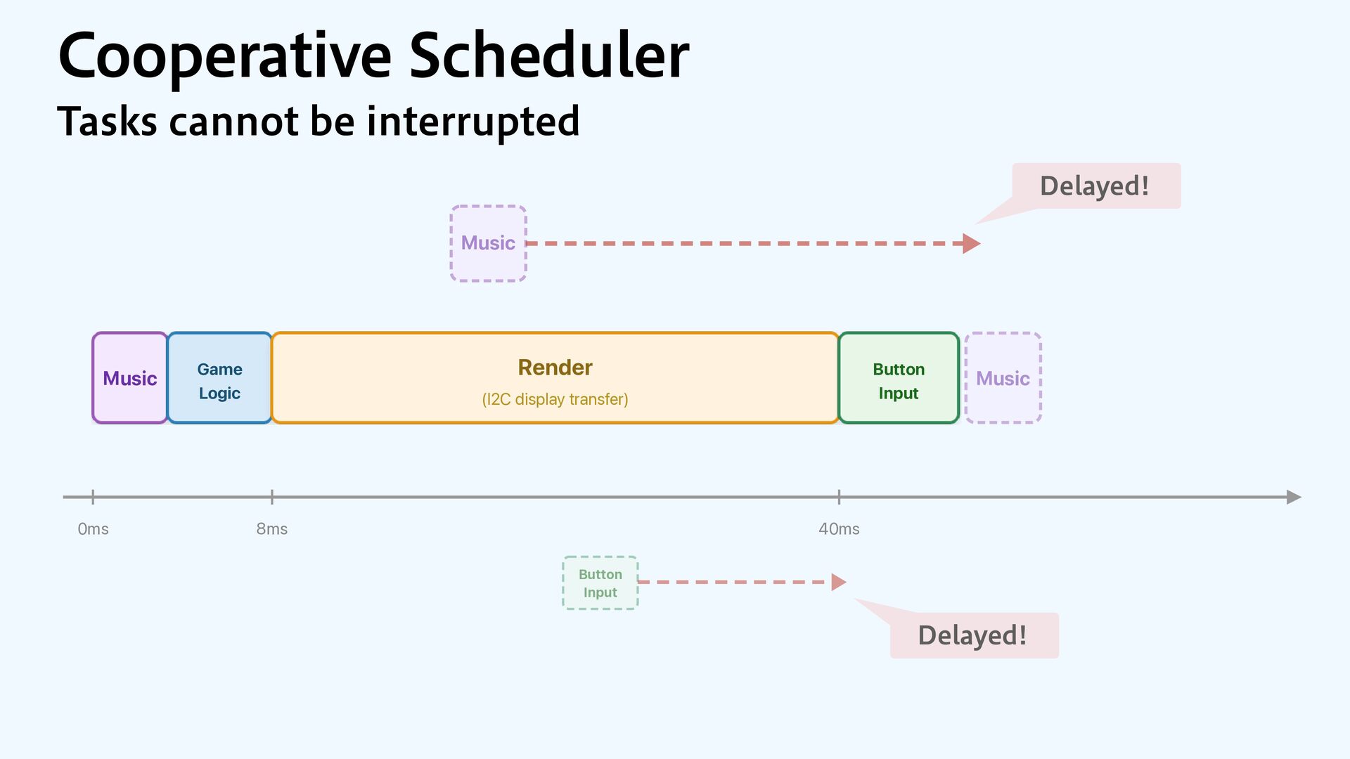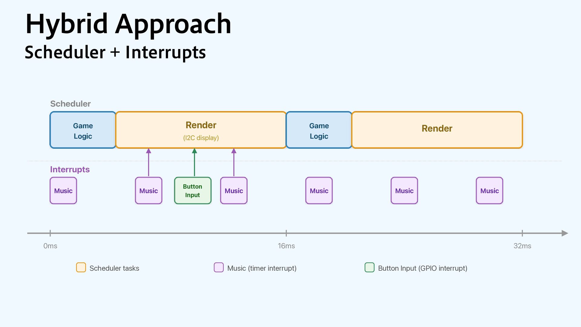 Render (I2C display) Game Logic Render Music Music Music Music Music Music Button Input Scheduler tasks Music (timer interrupt) Button Input (GPIO interrupt)
