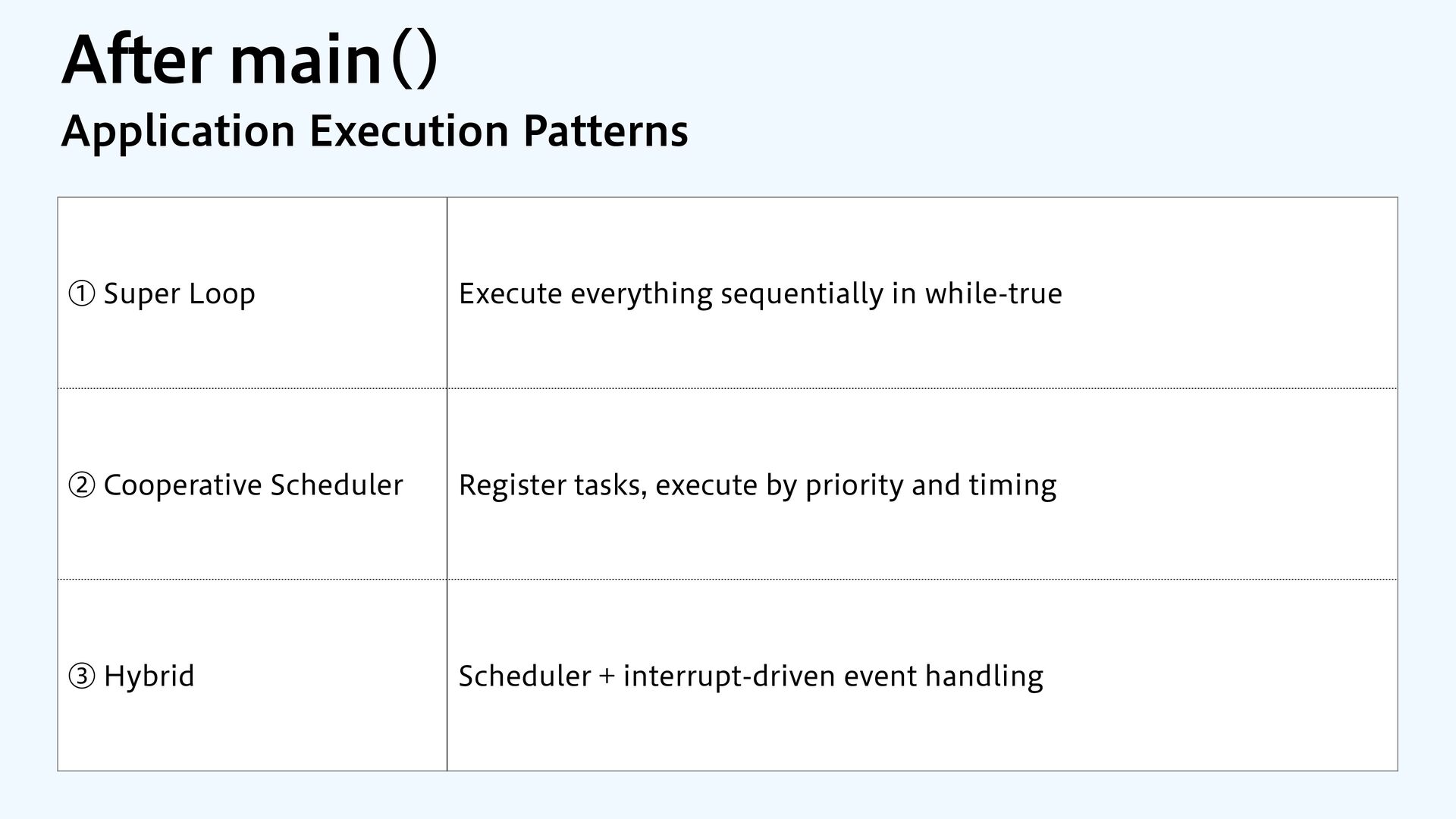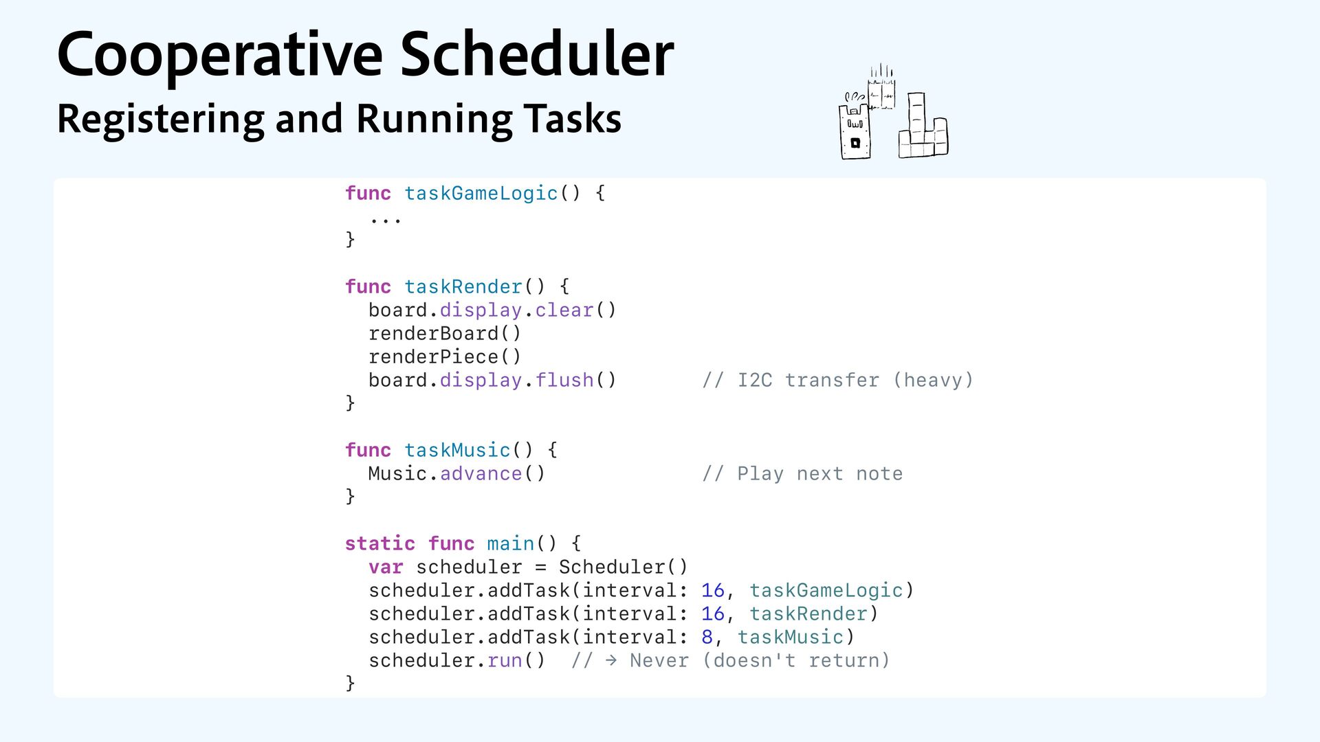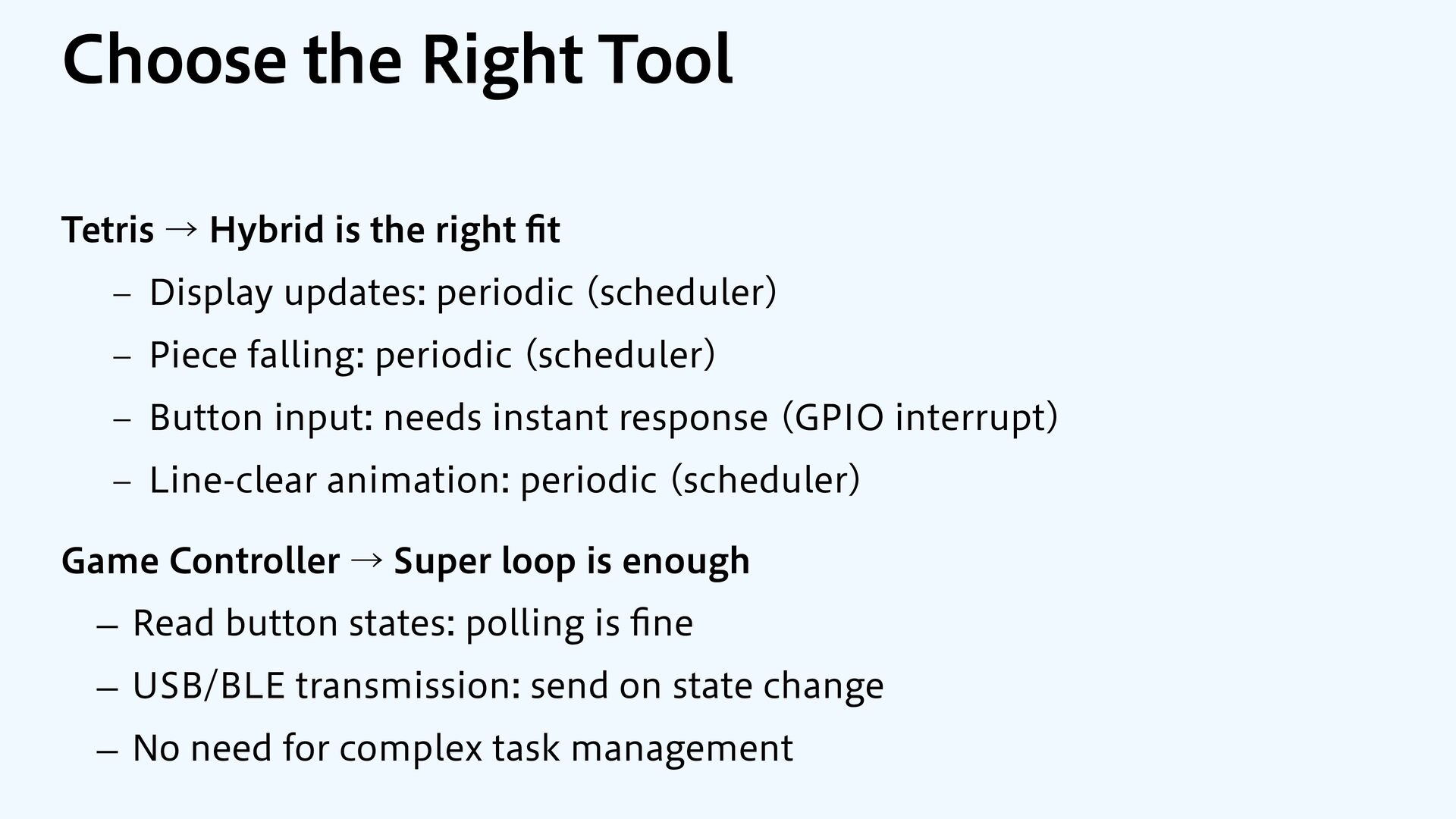 Render (I2C display) Game Logic Render Music Music Music Music Music Music Button Input Scheduler tasks Music (timer interrupt) Button Input (GPIO interrupt)