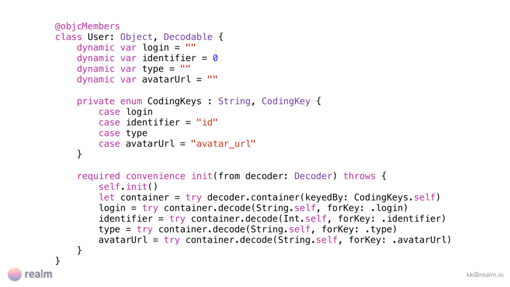 name = "" dynamic var age = 0 dynamic var owner: Person! let owners = LinkingObjects(fromType: Person.self, property: "dogs") } @objcMembers class Person: Object { dynamic var name = "" dynamic var age = 0 dynamic var birthdate = Date() let dogs = List<Dog>() }