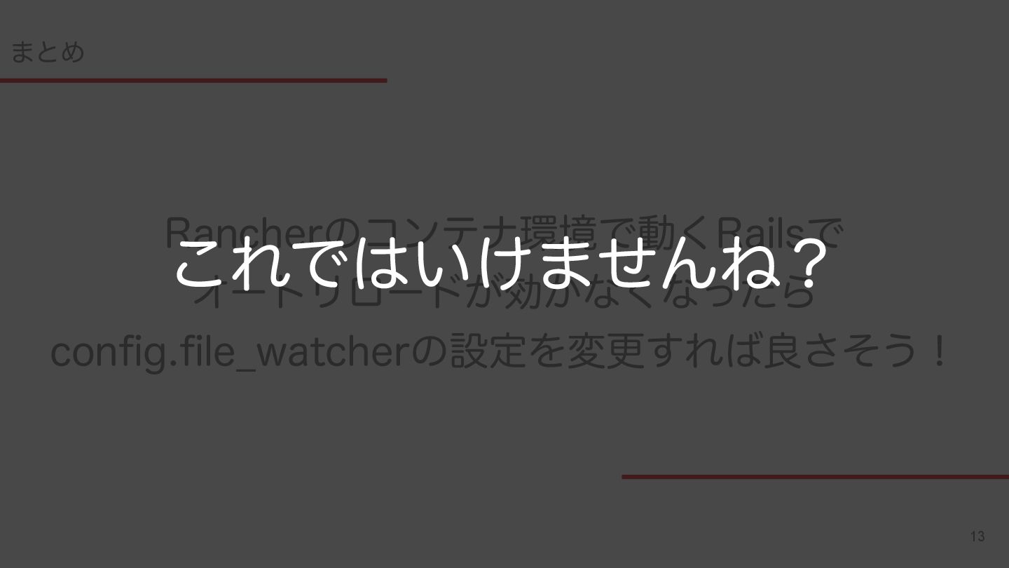 13 ·ͱΊ 3BODIFSͷίϯςφڥͰಈ͘3BJMTͰ ΦʔτϦϩʔυ͕ޮ͔ͳ͘ͳͬͨΒ DPOGJHGJMF@XBUDIFSͷઃఆΛมߋ͢Εྑͦ͞͏ʂ ͜ΕͰ͍͚·ͤΜͶʁ