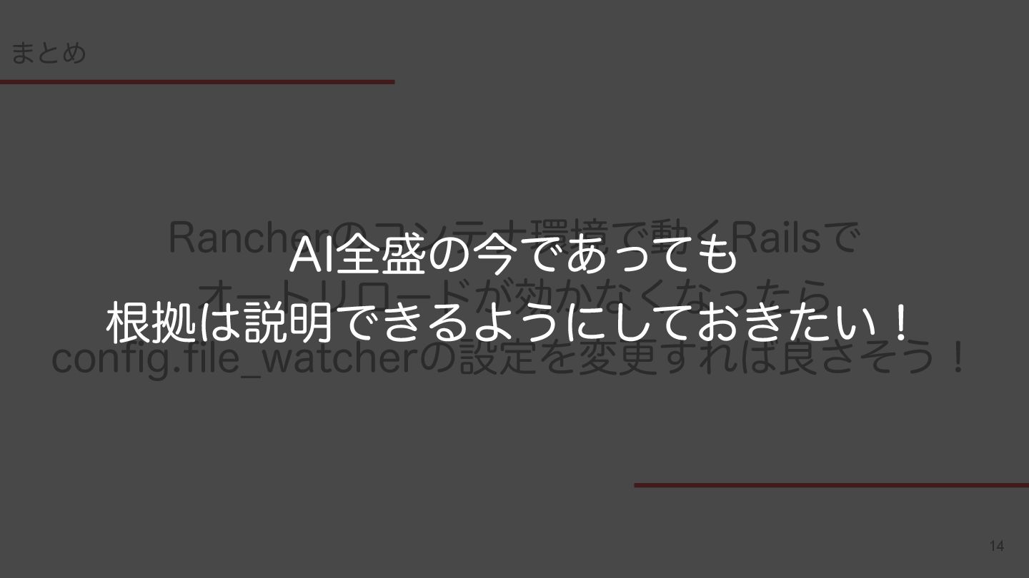 14 ·ͱΊ 3BODIFSͷίϯςφڥͰಈ͘3BJMTͰ ΦʔτϦϩʔυ͕ޮ͔ͳ͘ͳͬͨΒ DPOGJHGJMF@XBUDIFSͷઃఆΛมߋ͢Εྑͦ͞͏ʂ "*શͷࠓͰ͋ͬͯ ࠜڌઆ໌Ͱ͖ΔΑ͏ʹ͓͖͍ͯͨ͠ʂ