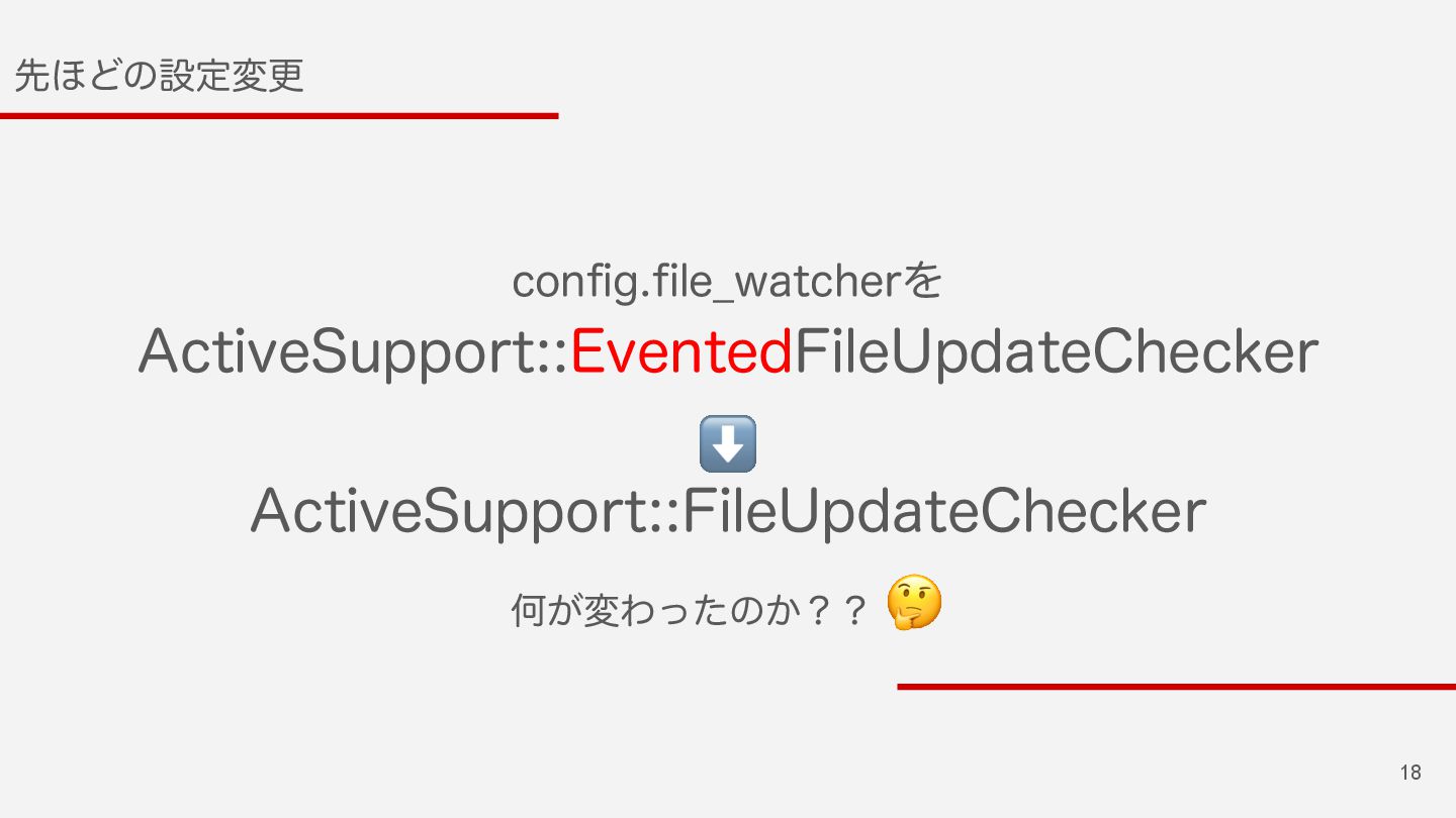 18 ઌ΄Ͳͷઃఆมߋ DPOGJHGJMF@XBUDIFSΛ "DUJWF4VQQPSU&WFOUFE'JMF6QEBUF$IFDLFS ⬇ "DUJWF4VQQPSU'JMF6QEBUF$IFDLFS Կ͕มΘͬͨͷ͔ʁʁ 🤔