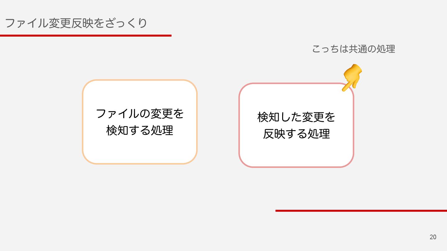 19 ϑΝΠϧมߋөΛͬ͘͟Γ ϑΝΠϧͷมߋΛ ݕ͢Δॲཧ ݕͨ͠มߋΛ ө͢Δॲཧ 👉 ઃఆʹΑͬͯมߋ͞Εͨ