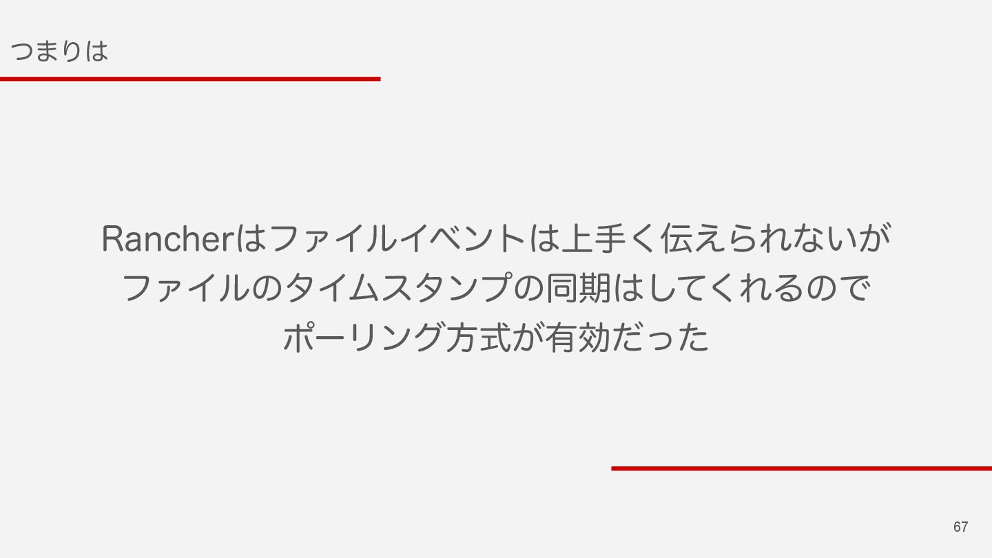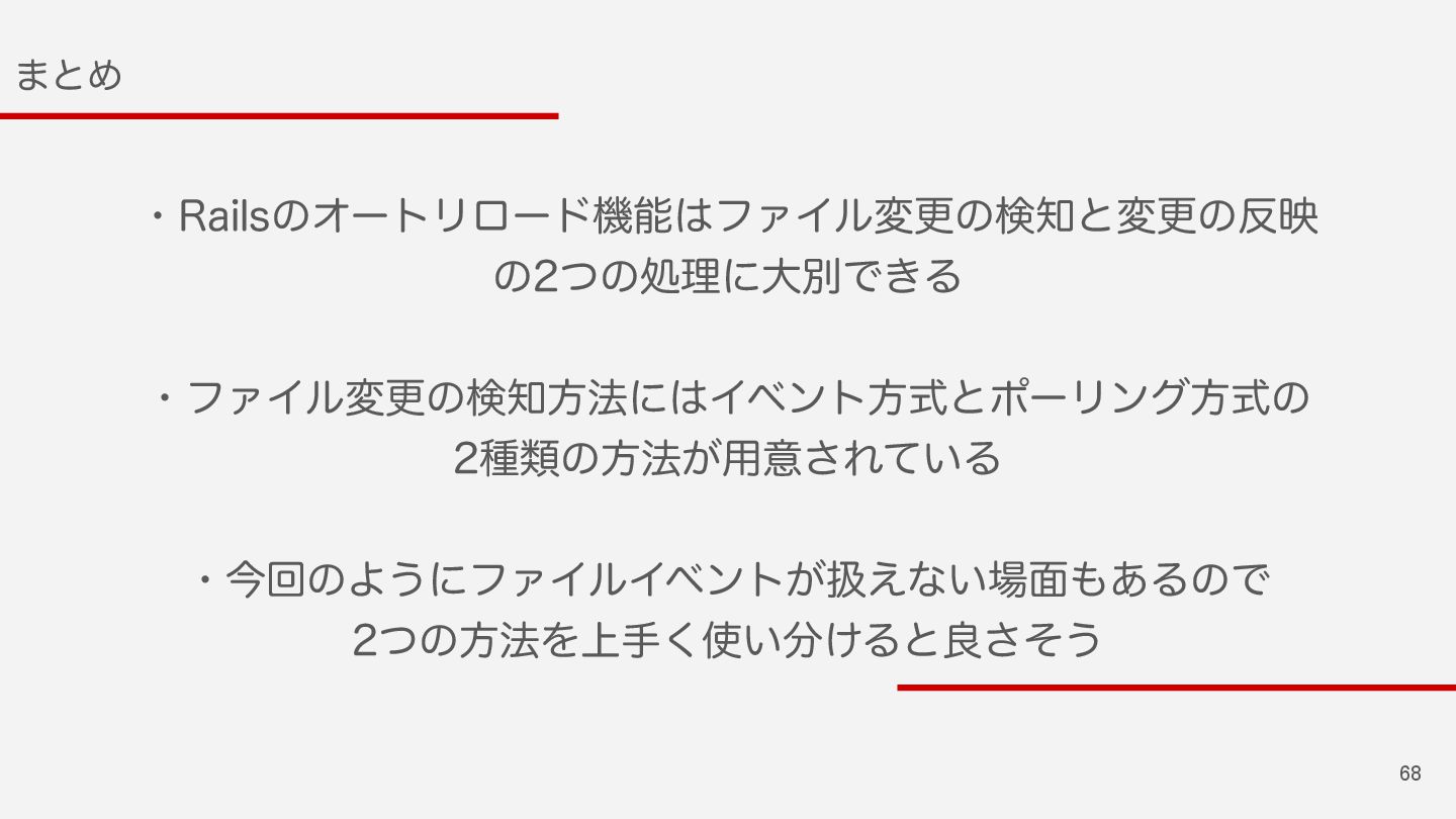 68 ·ͱΊ ɾ3BJMTͷΦʔτϦϩʔυػೳϑΝΠϧมߋͷݕͱมߋͷө ͷͭͷॲཧʹେผͰ͖Δ ɾϑΝΠϧมߋͷݕํ๏ʹΠϕϯτํࣜͱϙʔϦϯάํࣜͷ छྨͷํ๏͕༻ҙ͞Ε͍ͯΔ ɾࠓճͷΑ͏ʹϑΝΠϧΠϕϯτ͕ѻ͑ͳ͍໘͋ΔͷͰ ͭͷํ๏Λ্ख͍͚͘Δͱྑͦ͞͏