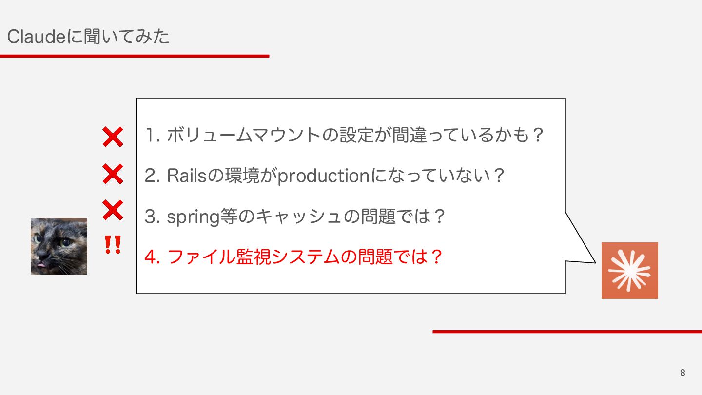 8 $MBVEFʹฉ͍ͯΈͨ ϘϦϡʔϜϚϯτͷઃఆ͕ؒҧ͍ͬͯΔ͔ʁ 3BJMTͷڥ͕QSPEVDUJPOʹͳ͍ͬͯͳ͍ʁ TQSJOHͷΩϟογϡͷͰʁ ϑΝΠϧࢹγεςϜͷͰʁ ❌ ❌ ❌ ‼